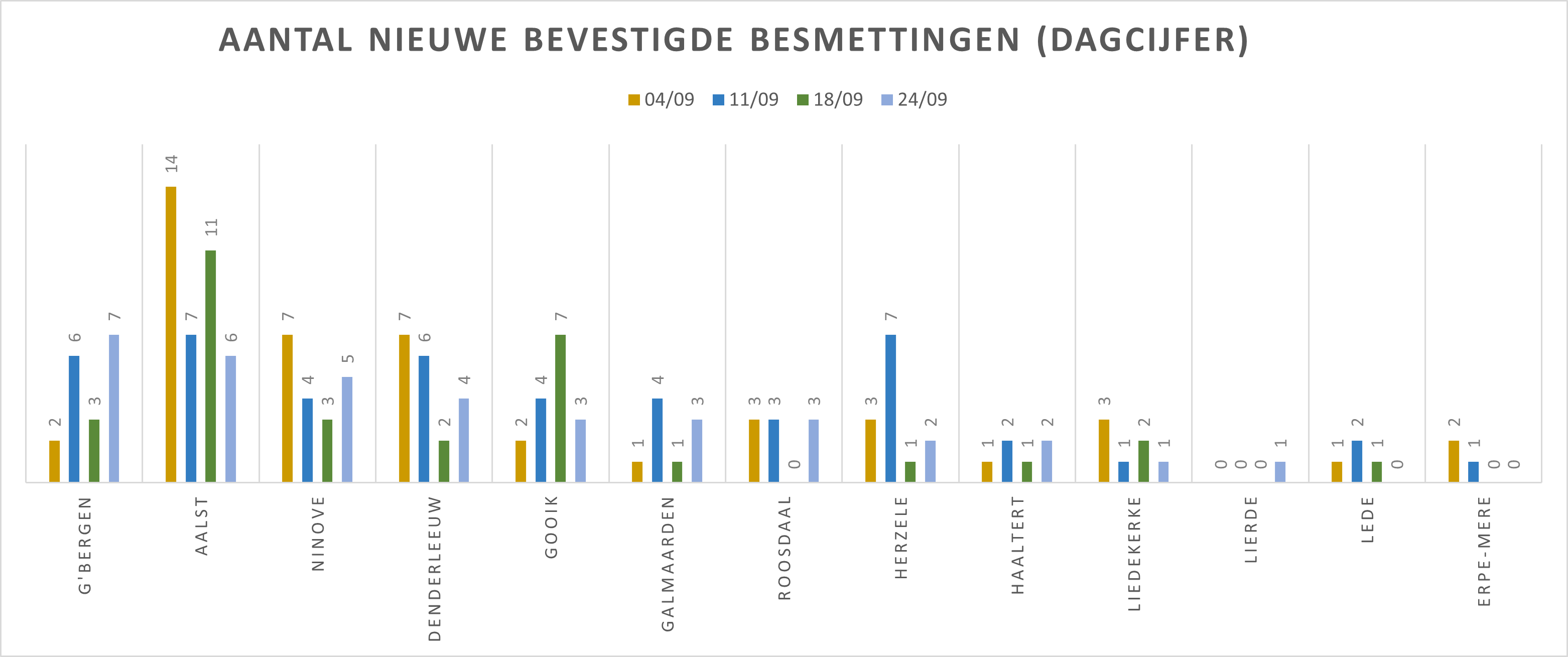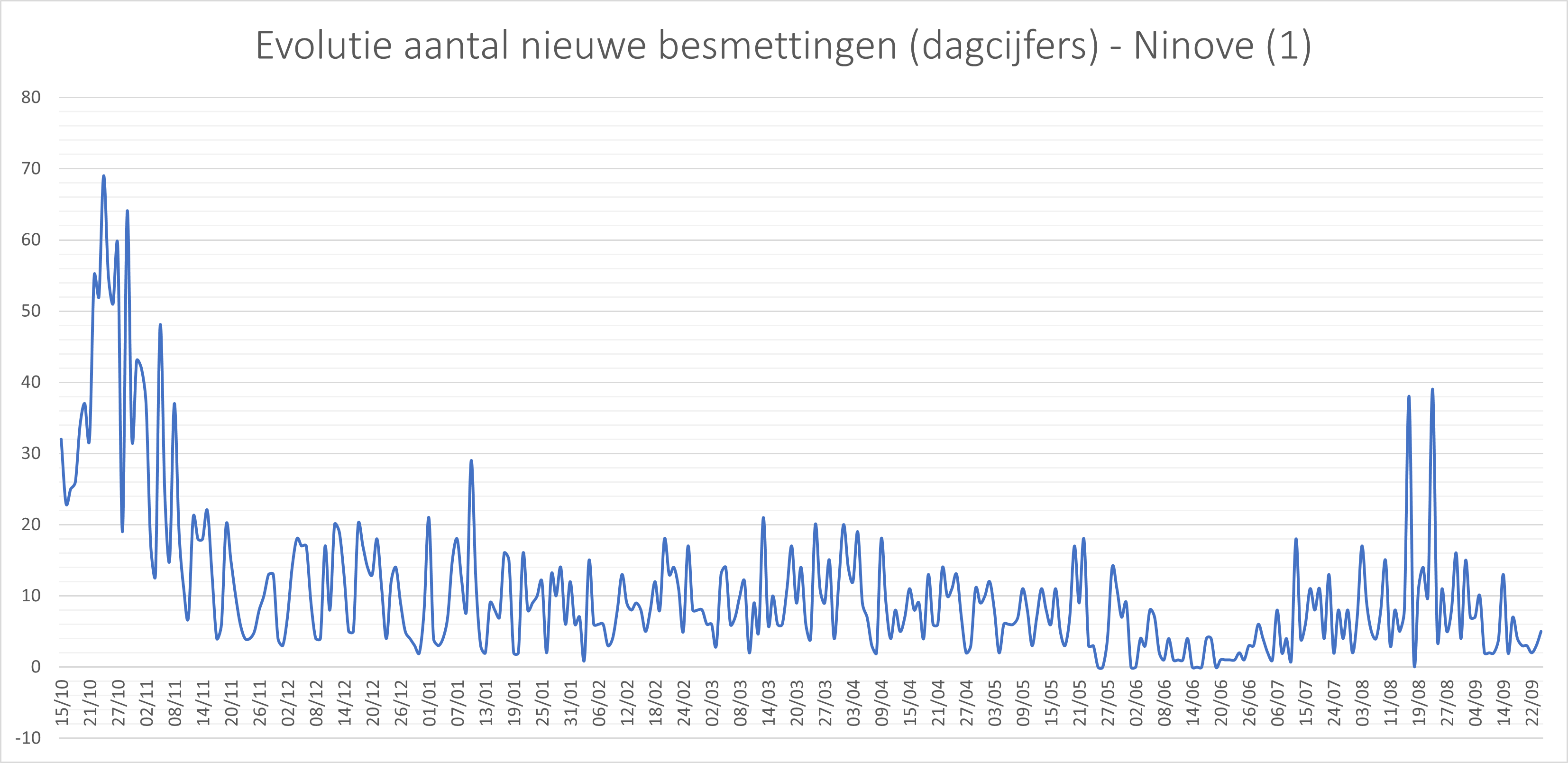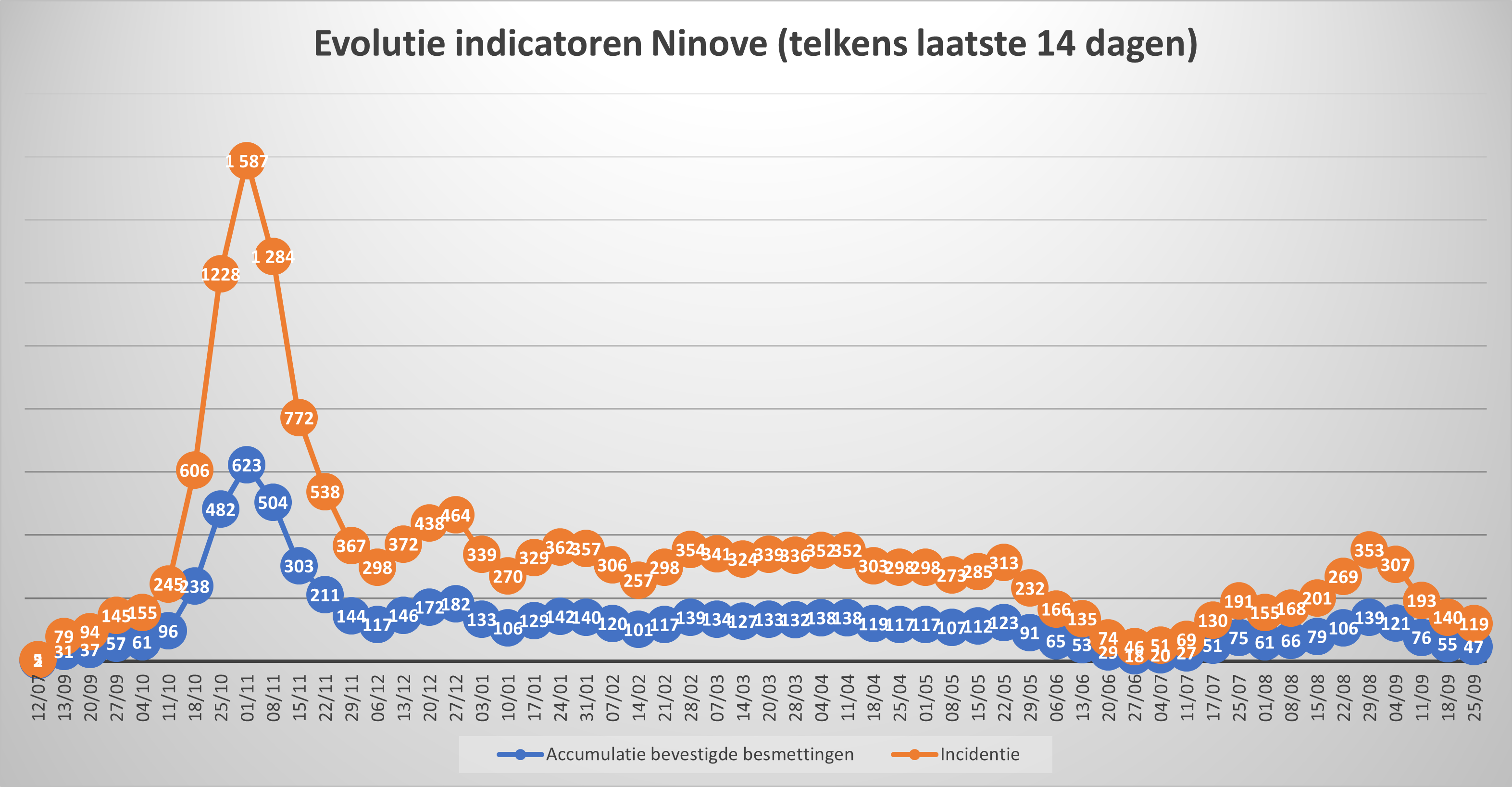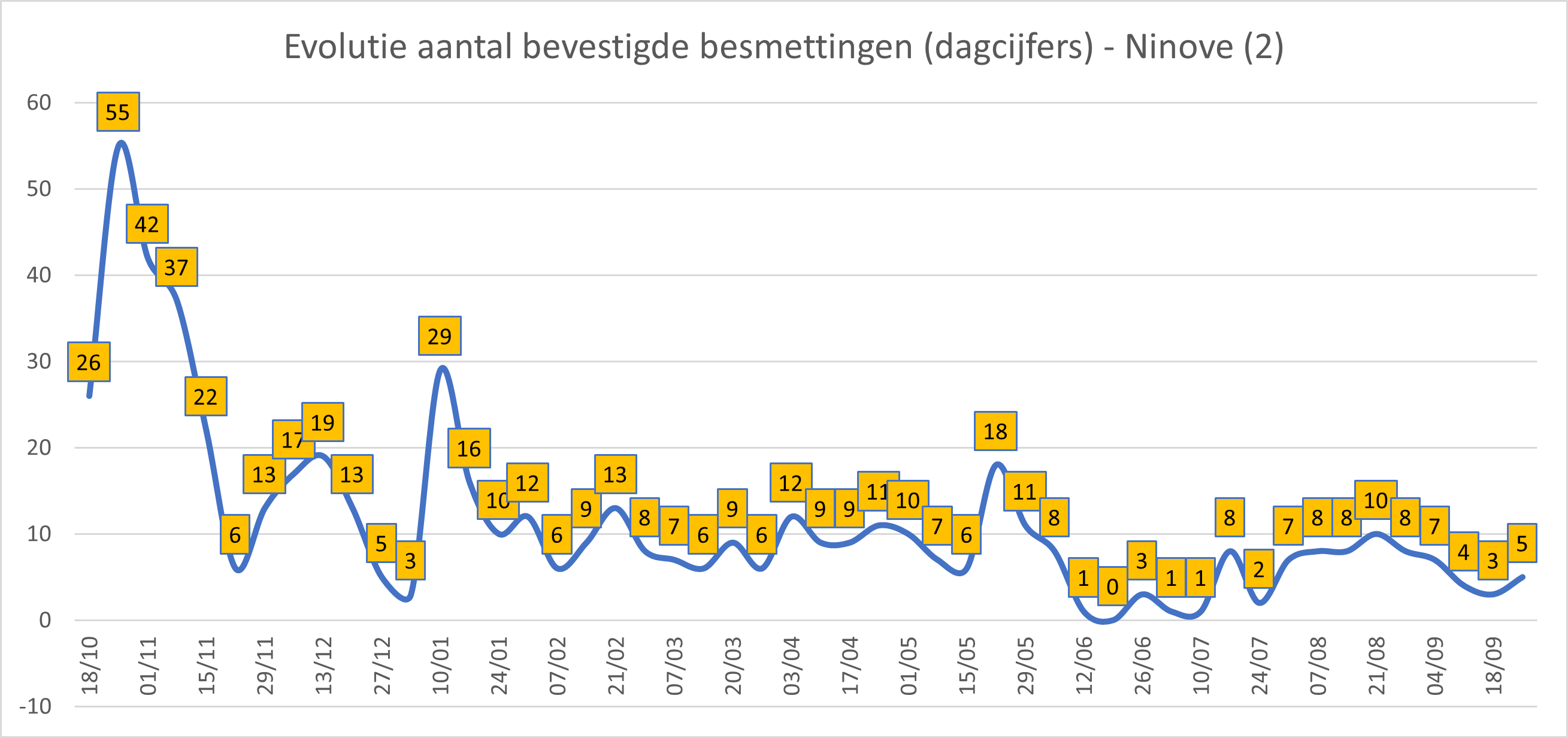 NINOVE – Volgens Sciensano zijn de afgelopen 14 dagen 47 bevestigde besmettingen genoteerd in Ninove. We brengen deze en andere cijfers van de omliggende steden en gemeenten elke week in kaart.