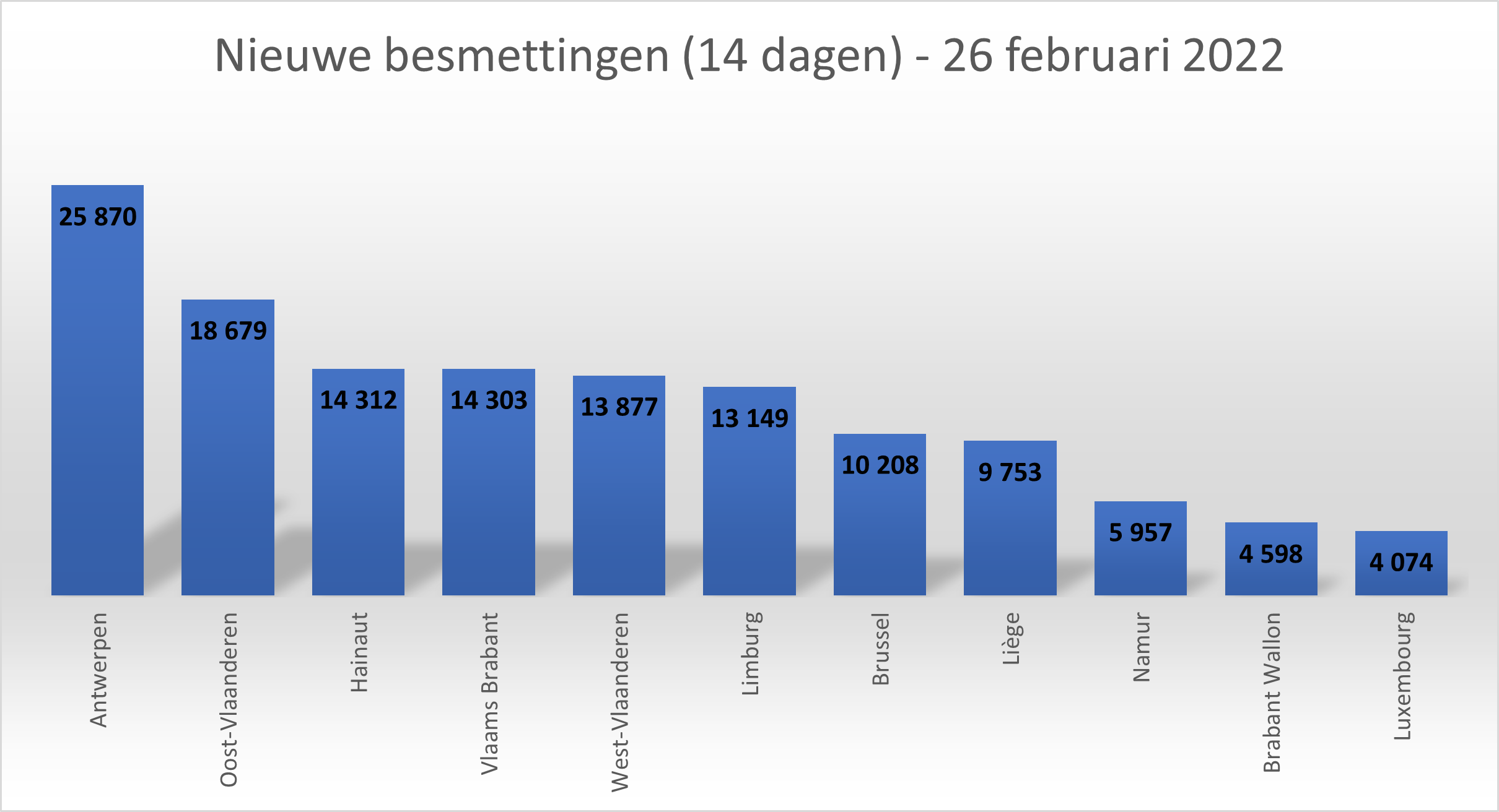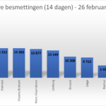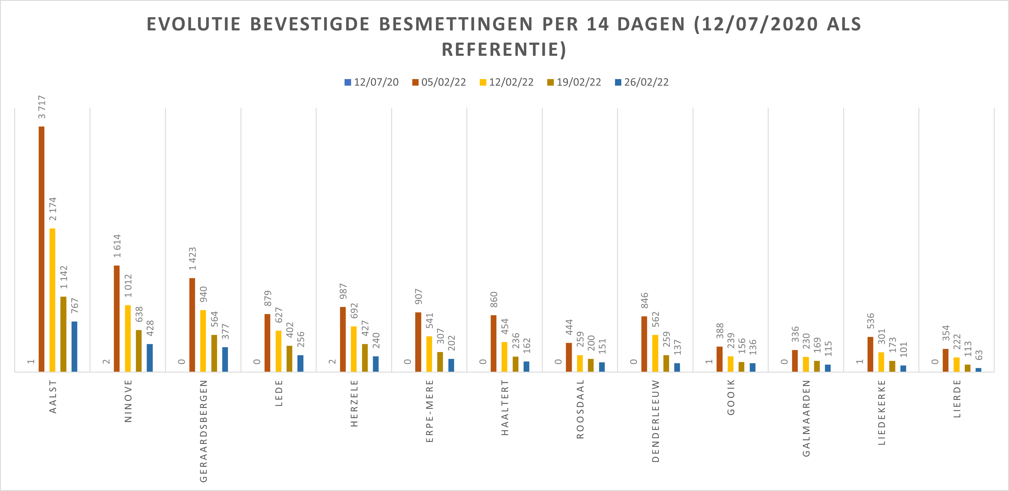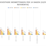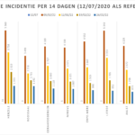 Hieronder een tabel met het aantal bevestigde besmettingen, telkens over een periode van 14 dagen (12 juli 2020 als referentie). Deze en de andere gegevens zetten we in grafieken (bijlagen).