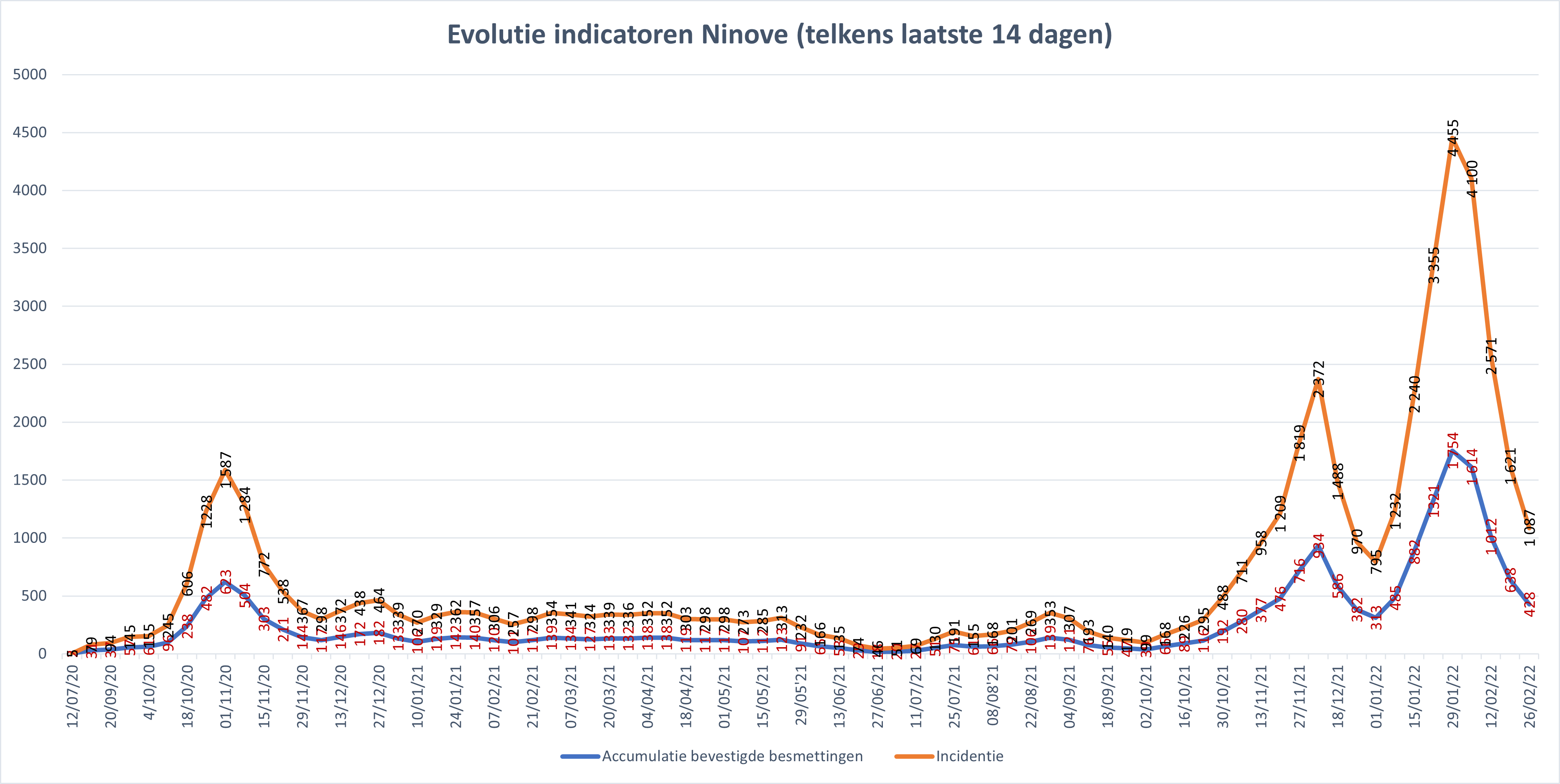 NINOVE – Volgens Sciensano zijn de afgelopen 14 dagen 428 bevestigde besmettingen genoteerd in Ninove. We brengen deze en andere cijfers van de omliggende steden en gemeenten elke week in kaart.