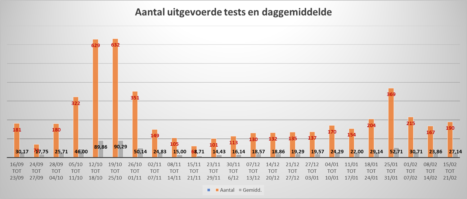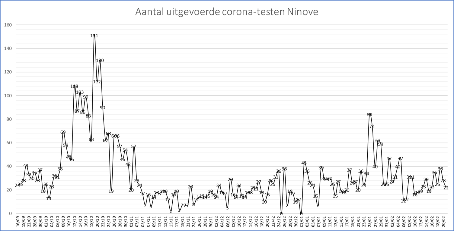 - In het testcentrum van Ninove zijn tot en met 21 februari 4.835 mensen getest. Daarin zijn niet de wekelijkse testen in het WZC Klateringen begrepen.