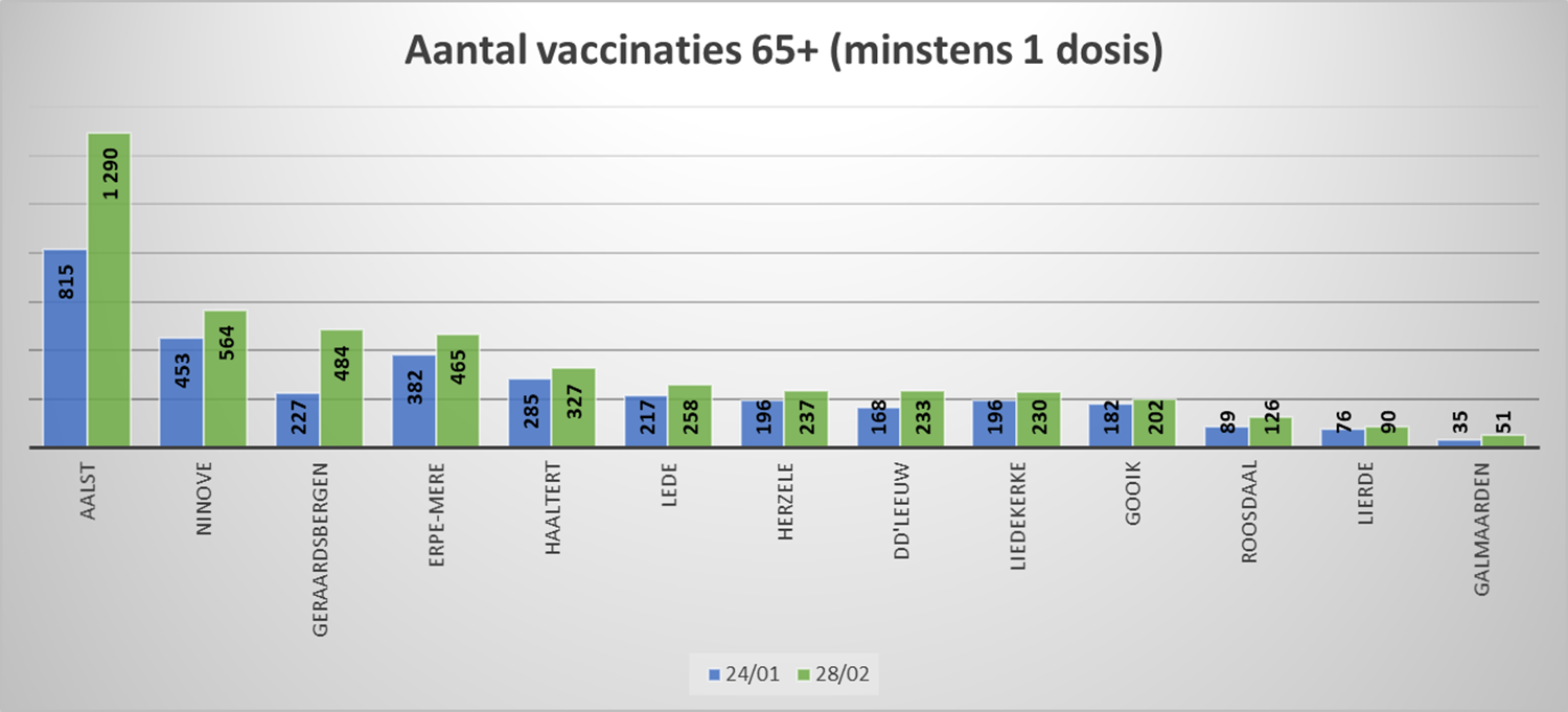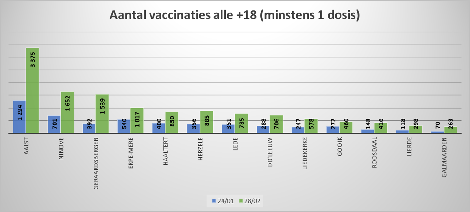 - Op 28 februari kregen 1.652 van alle +18-jarigen minstens 1 vaccinatieprik; 564 vaccins zijn toegediend in de leeftijdsgroep 65+ (ook minstens 1 prik).