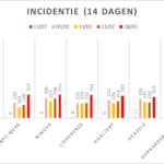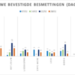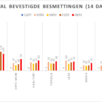 Hieronder een tabel met het aantal bevestigde besmettingen, telkens over een periode van 14 dagen (12 juli 2020 als referentie). Deze en de andere gegevens zetten we in grafieken (bijlagen).