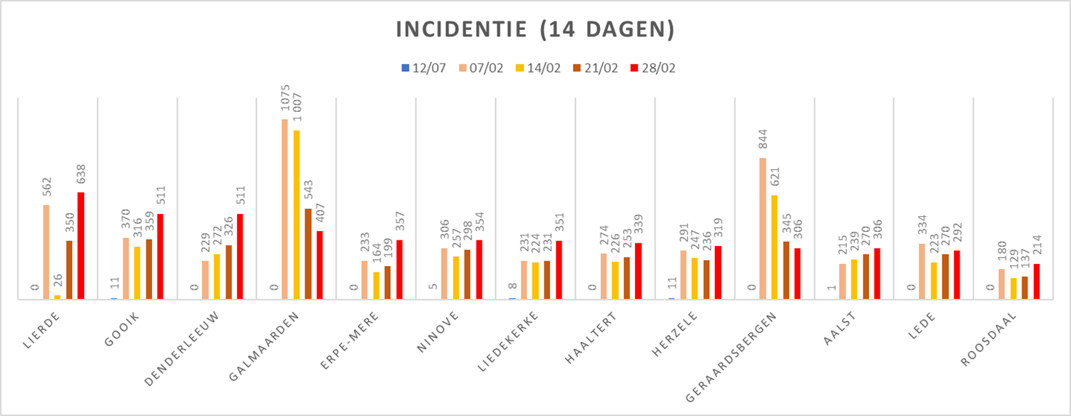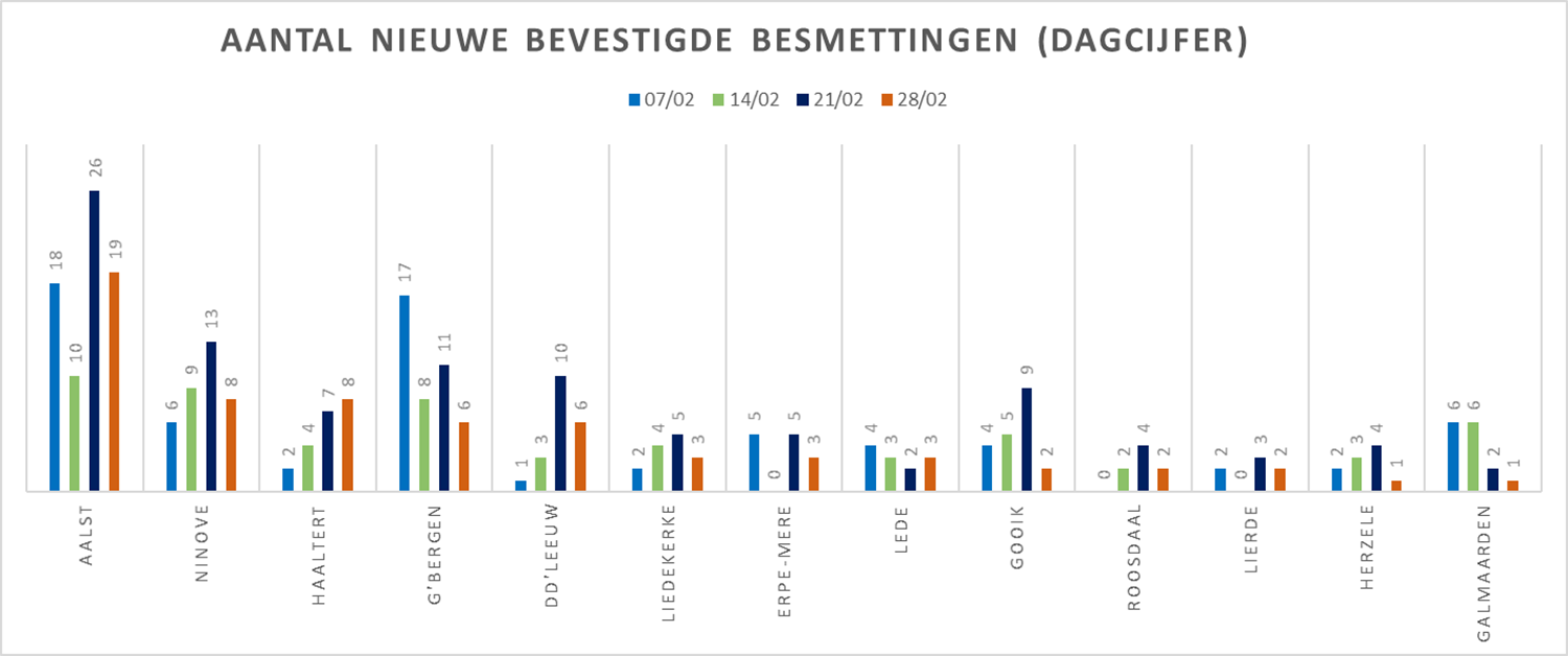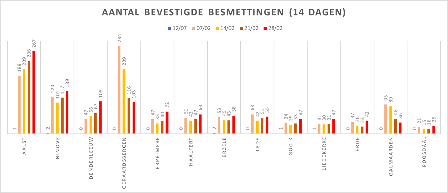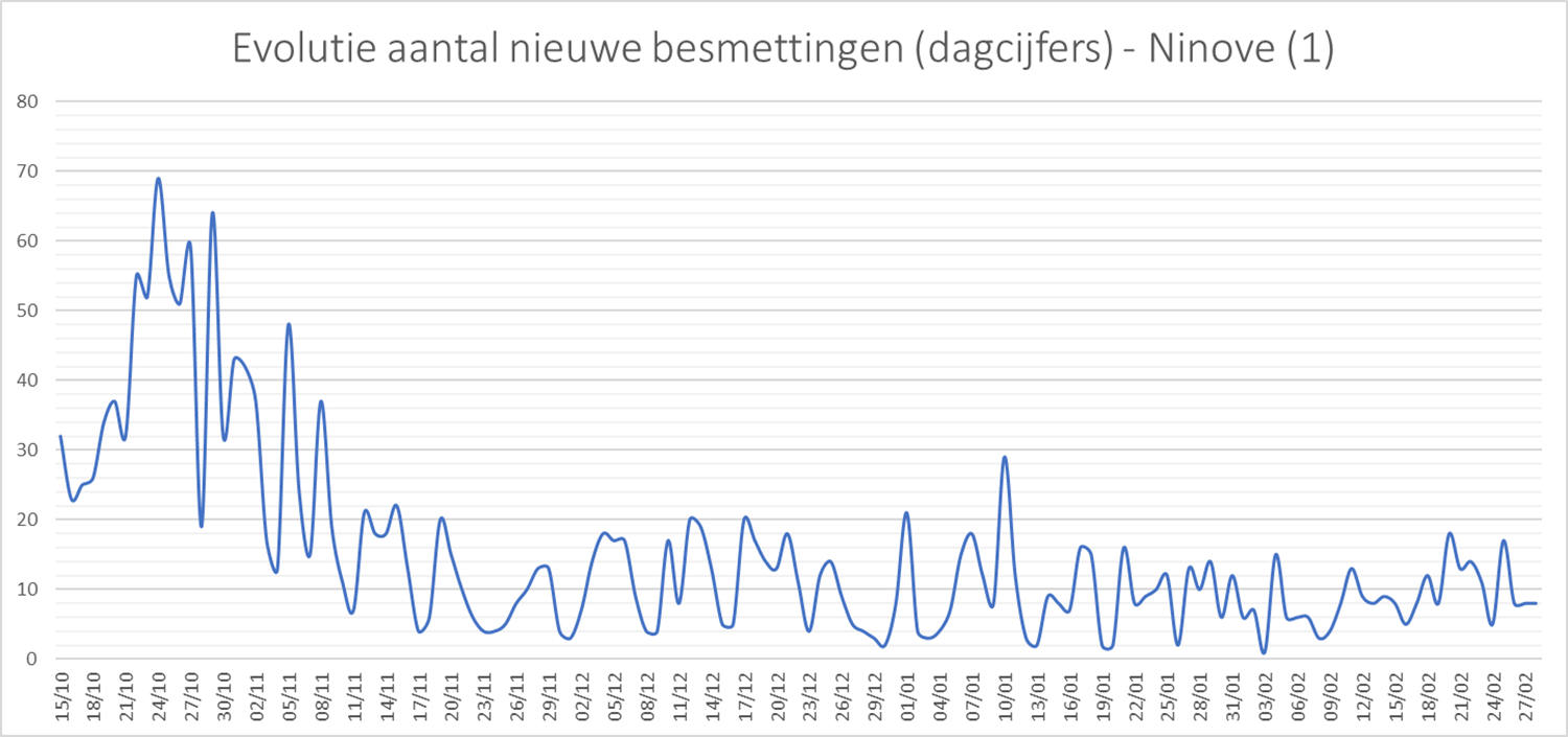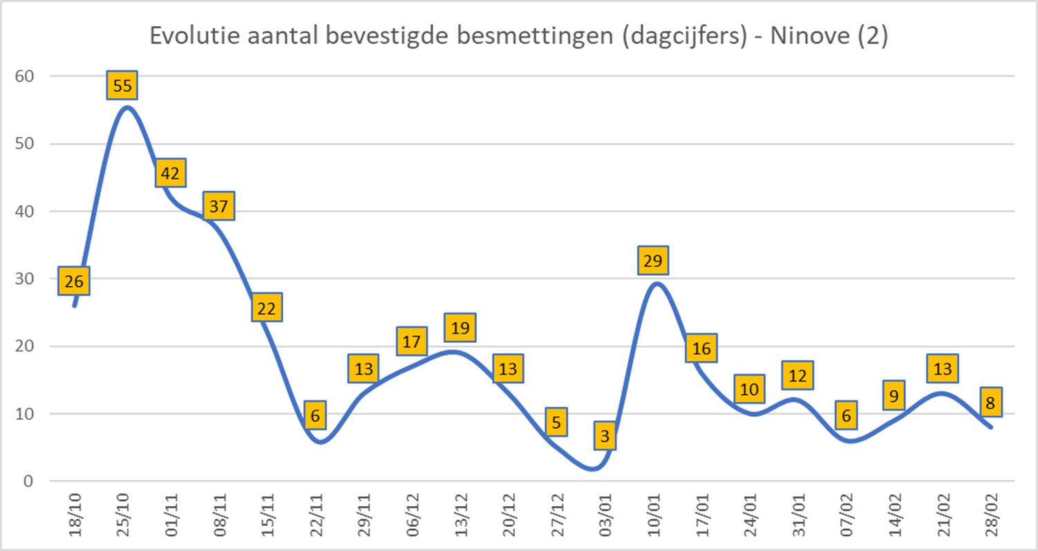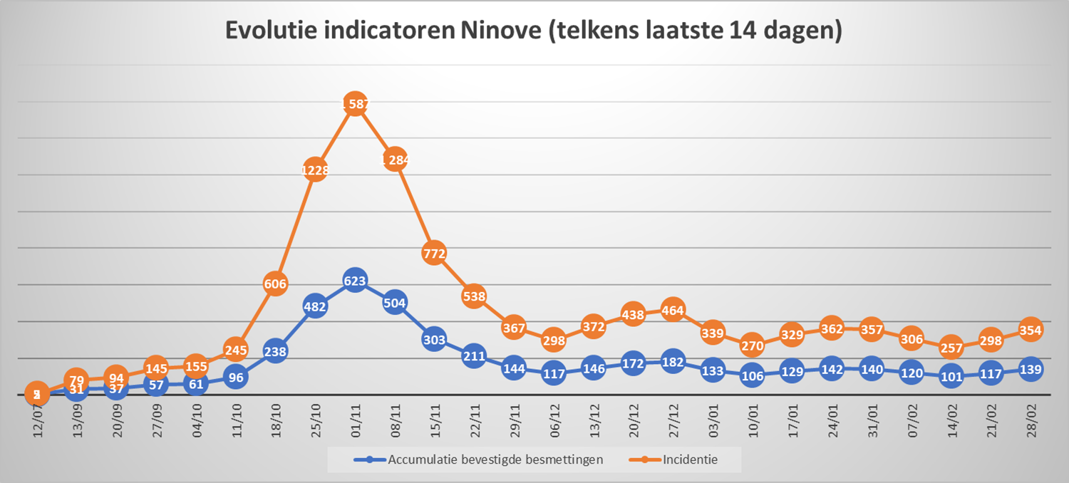 NINOVE – Volgens Sciensano zijn de afgelopen 14 dagen 139 bevestigde besmettingen genoteerd in Ninove. We brengen deze en andere cijfers van de omliggende steden en gemeenten elke week in kaart.