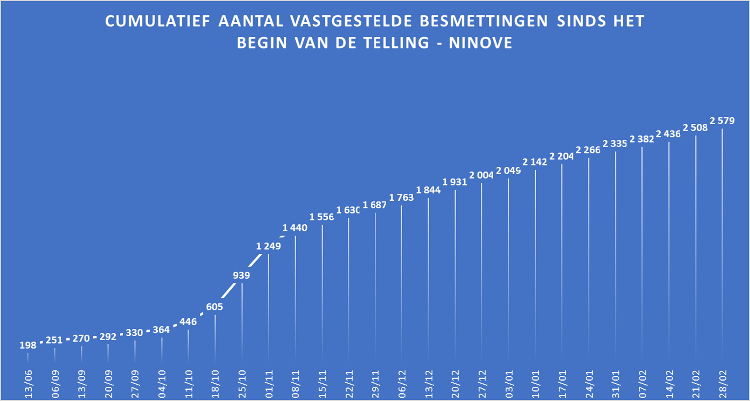 - In totaal zijn in Ninove 2.579 besmettingen genoteerd sinds het begin van de telling.