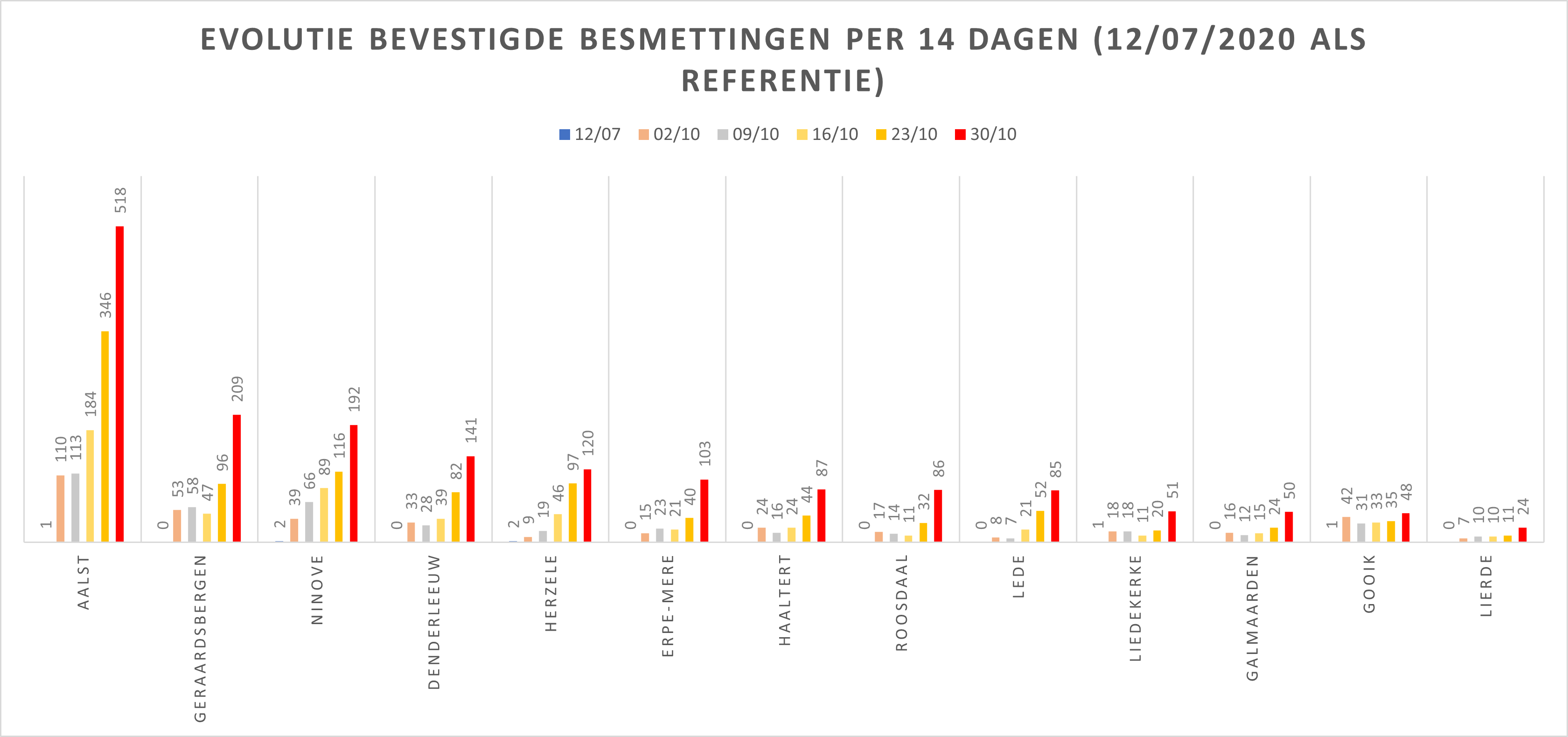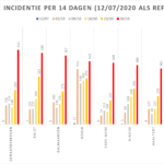 Hieronder een tabel met het aantal bevestigde besmettingen, telkens over een periode van 14 dagen (12 juli 2020 als referentie). Deze en de andere gegevens zetten we in grafieken (bijlagen).