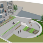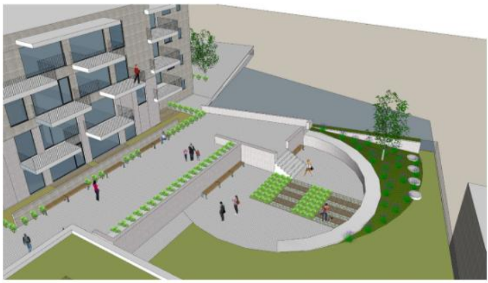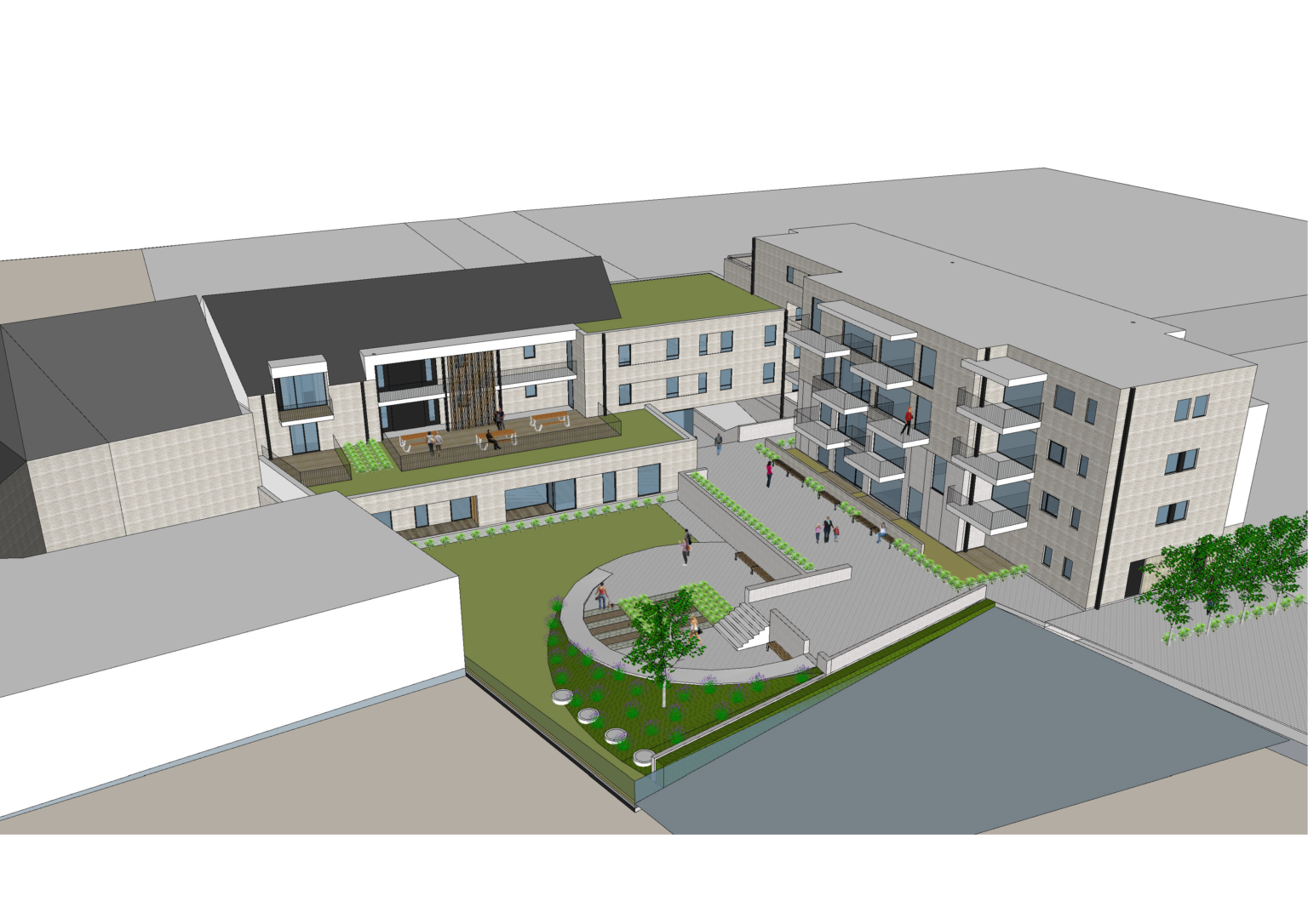Daar zou een complex komen met 2 bouwvolumes rond een groen binnenplein. Het project omvat 15 huur- en 13 koopappartementen. Er zijn eveneens een ondergrondse garage met 34 parkeerplaatsen, een fietsenstalling en private bergingen voorzien.