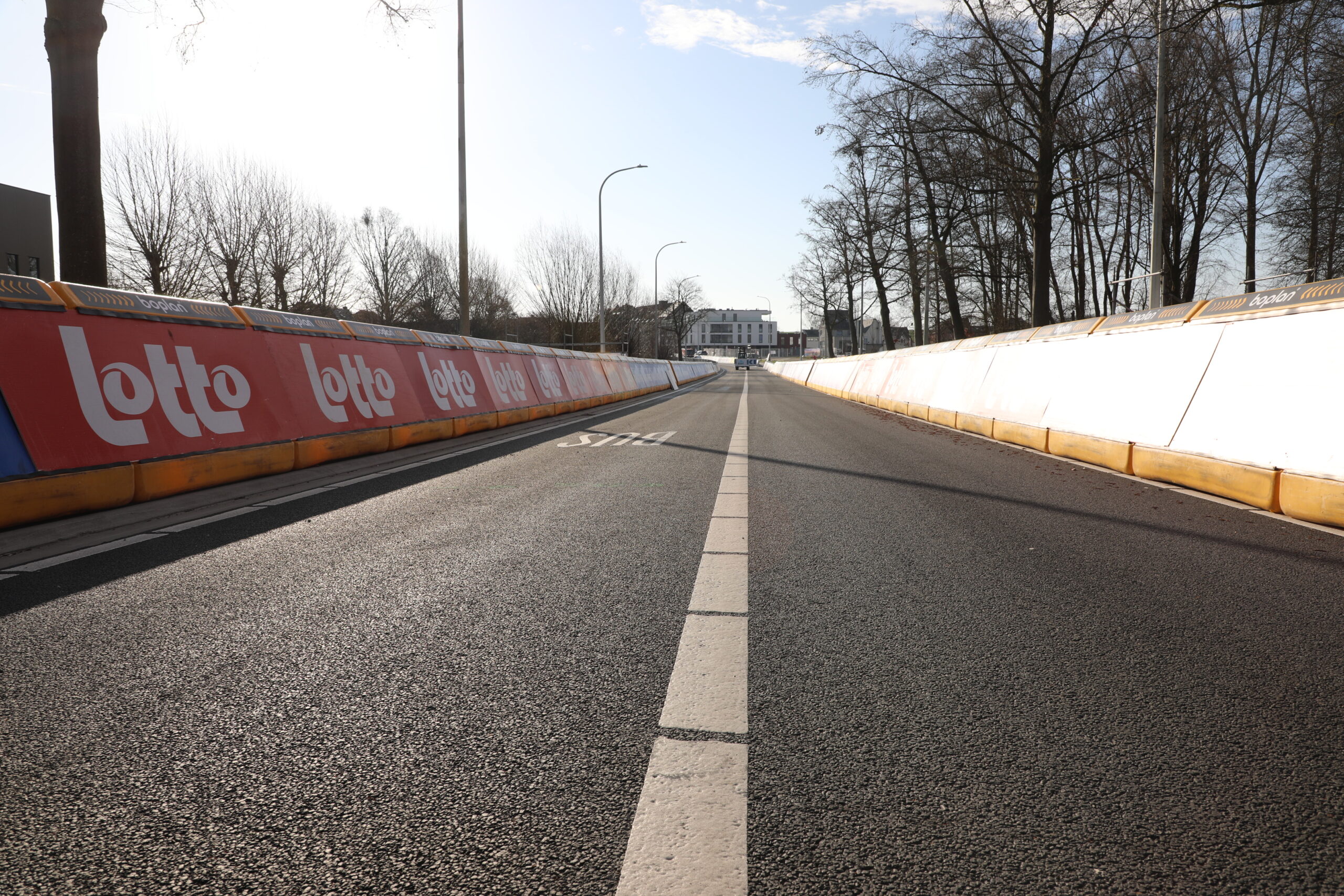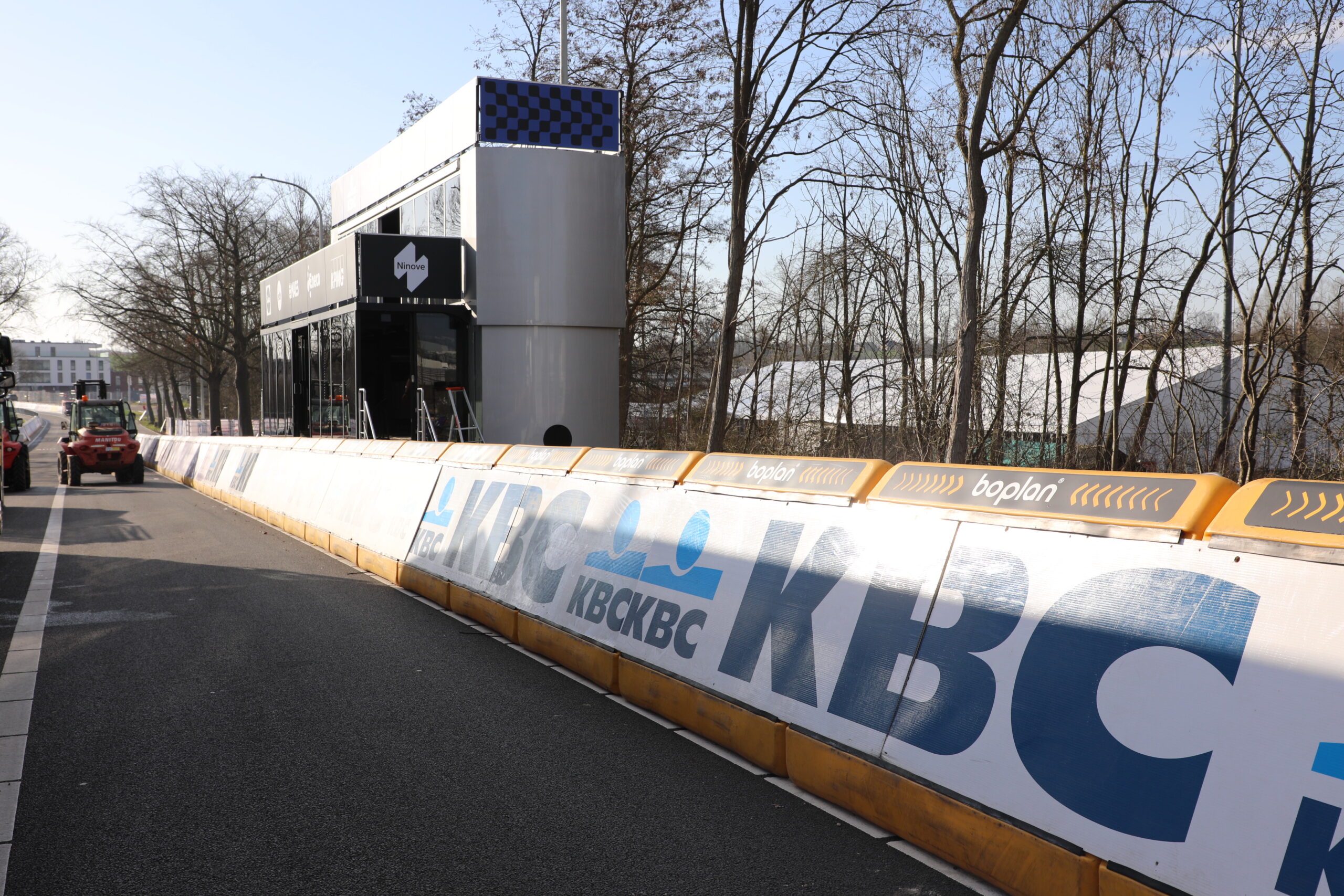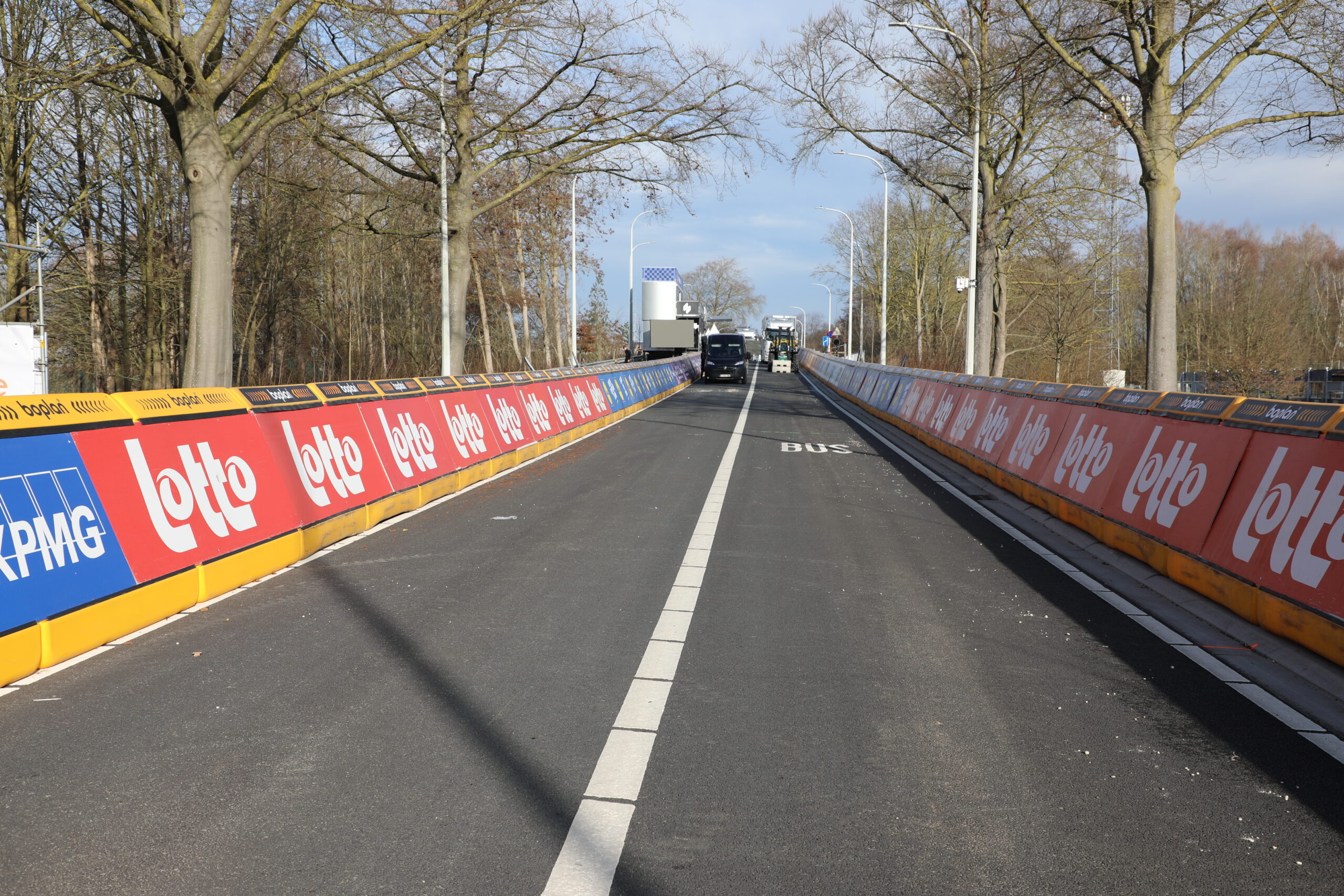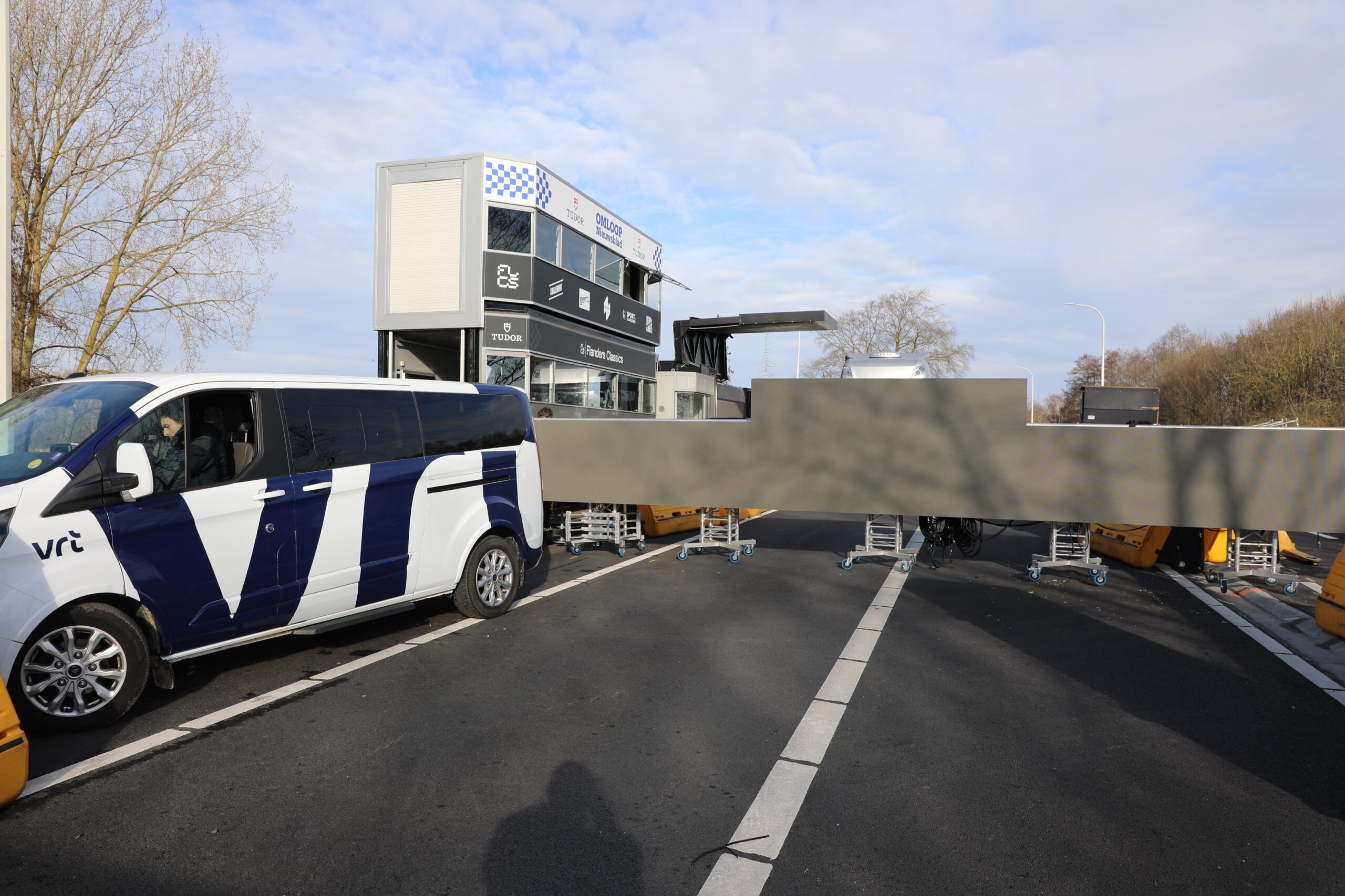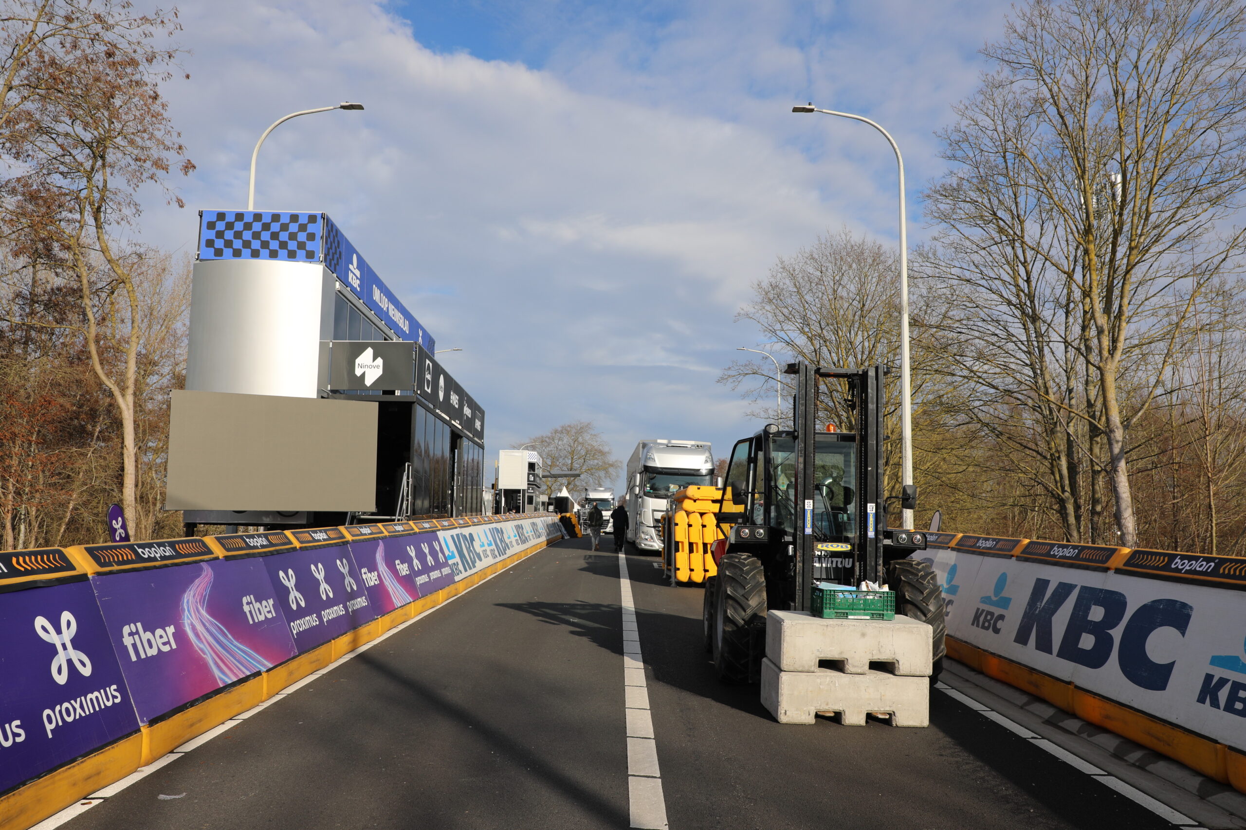 De dranghekken en de gele barrières en bumpers zijn geplaatst, de aankomstboog staat stevig, de lijn is gespoten en de VRT heeft een mediadorp opgetrokken in de laatste rechte lijn.