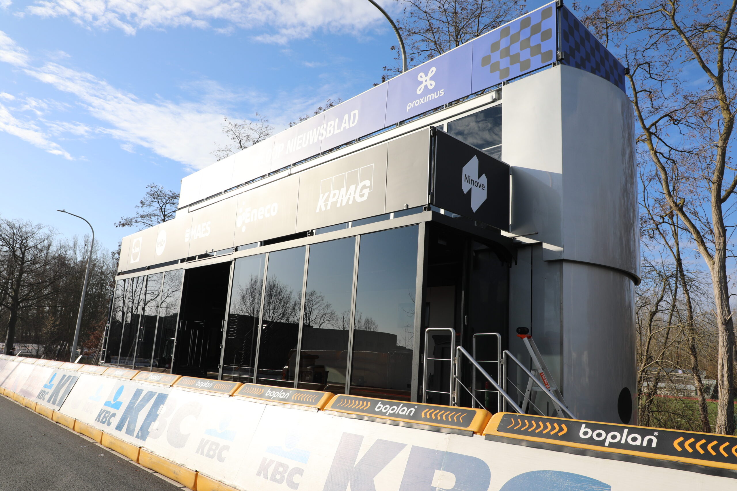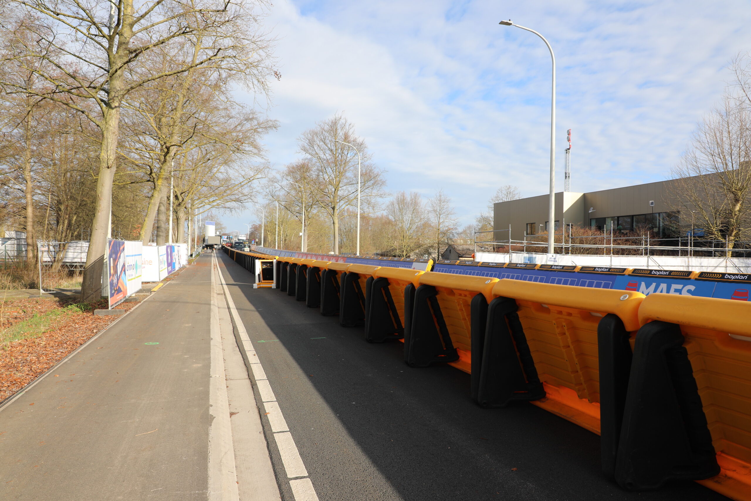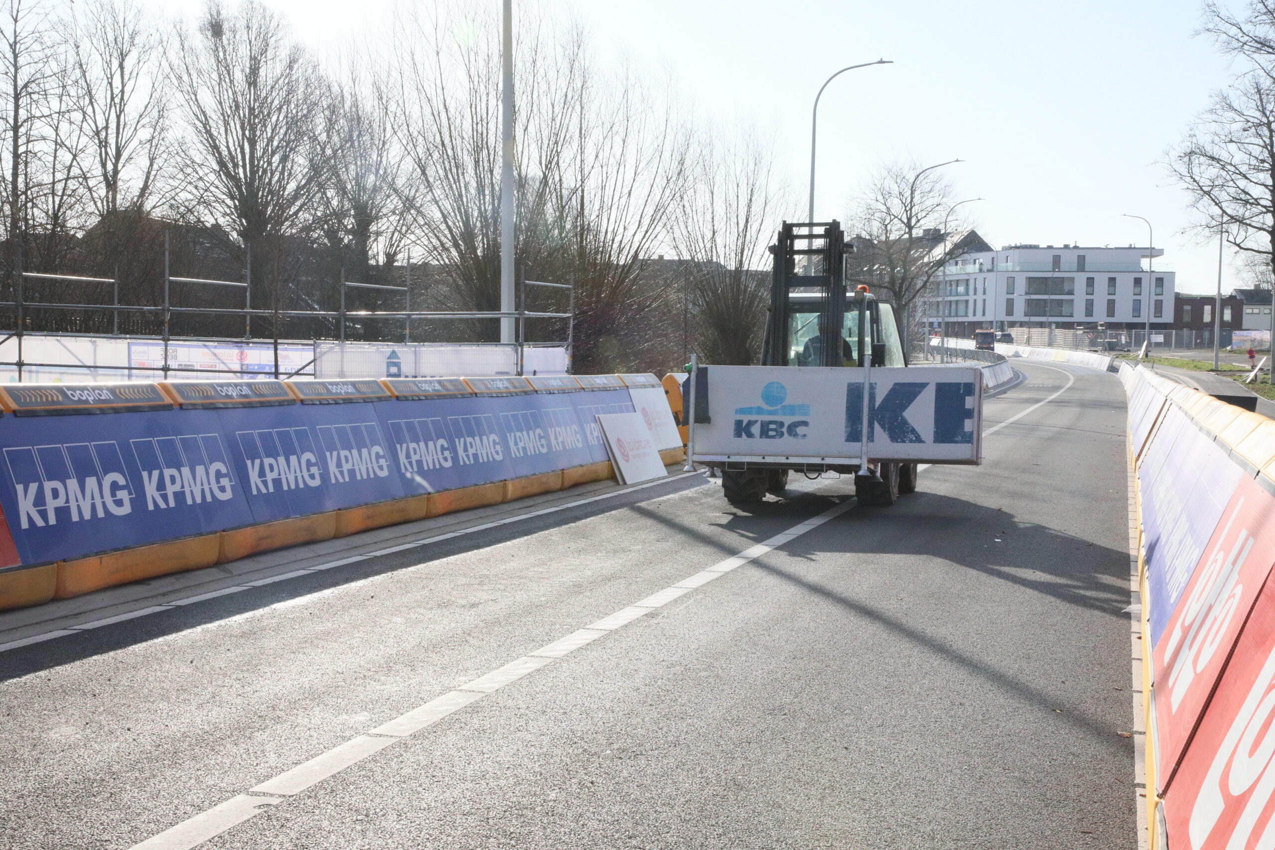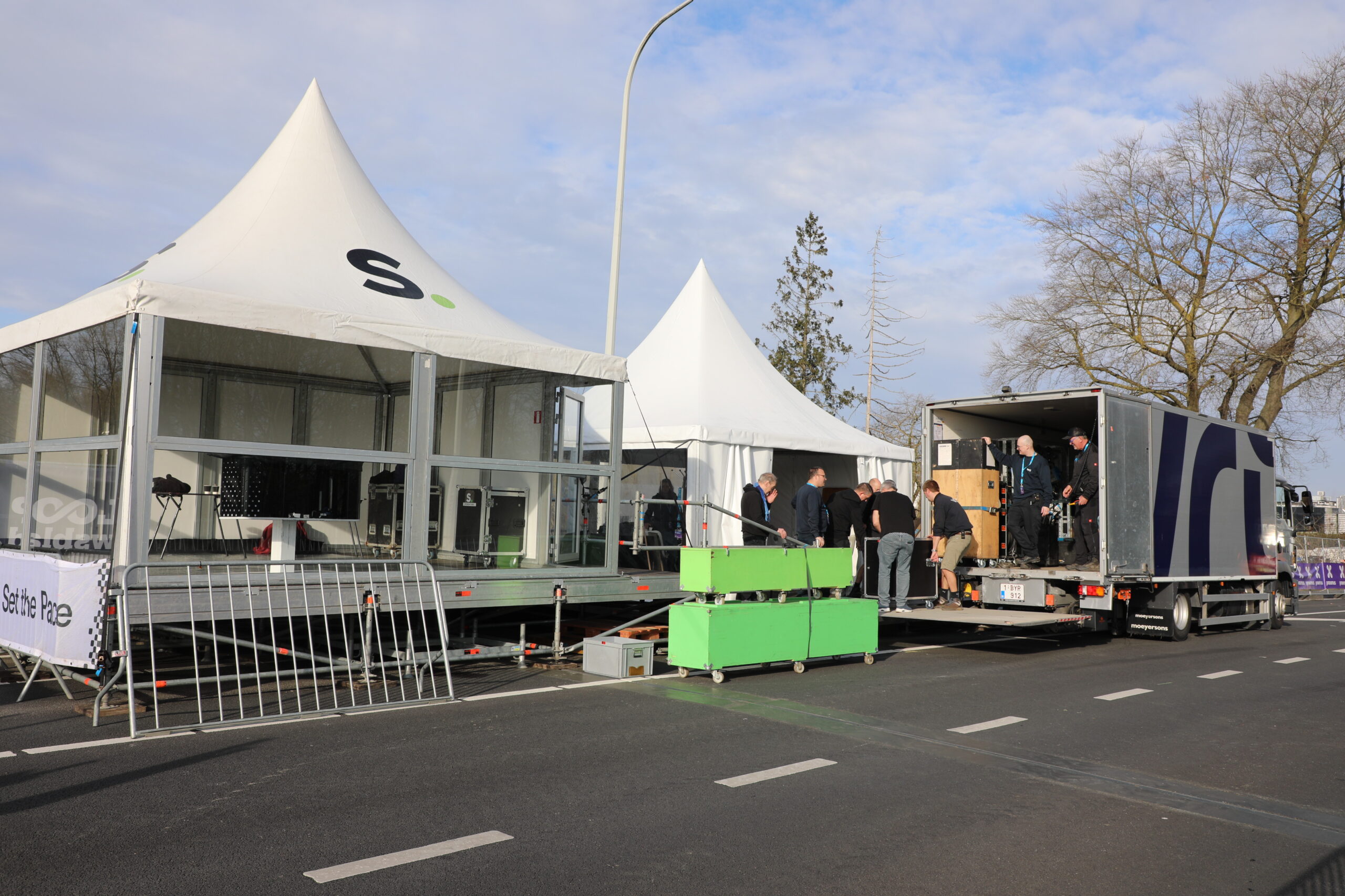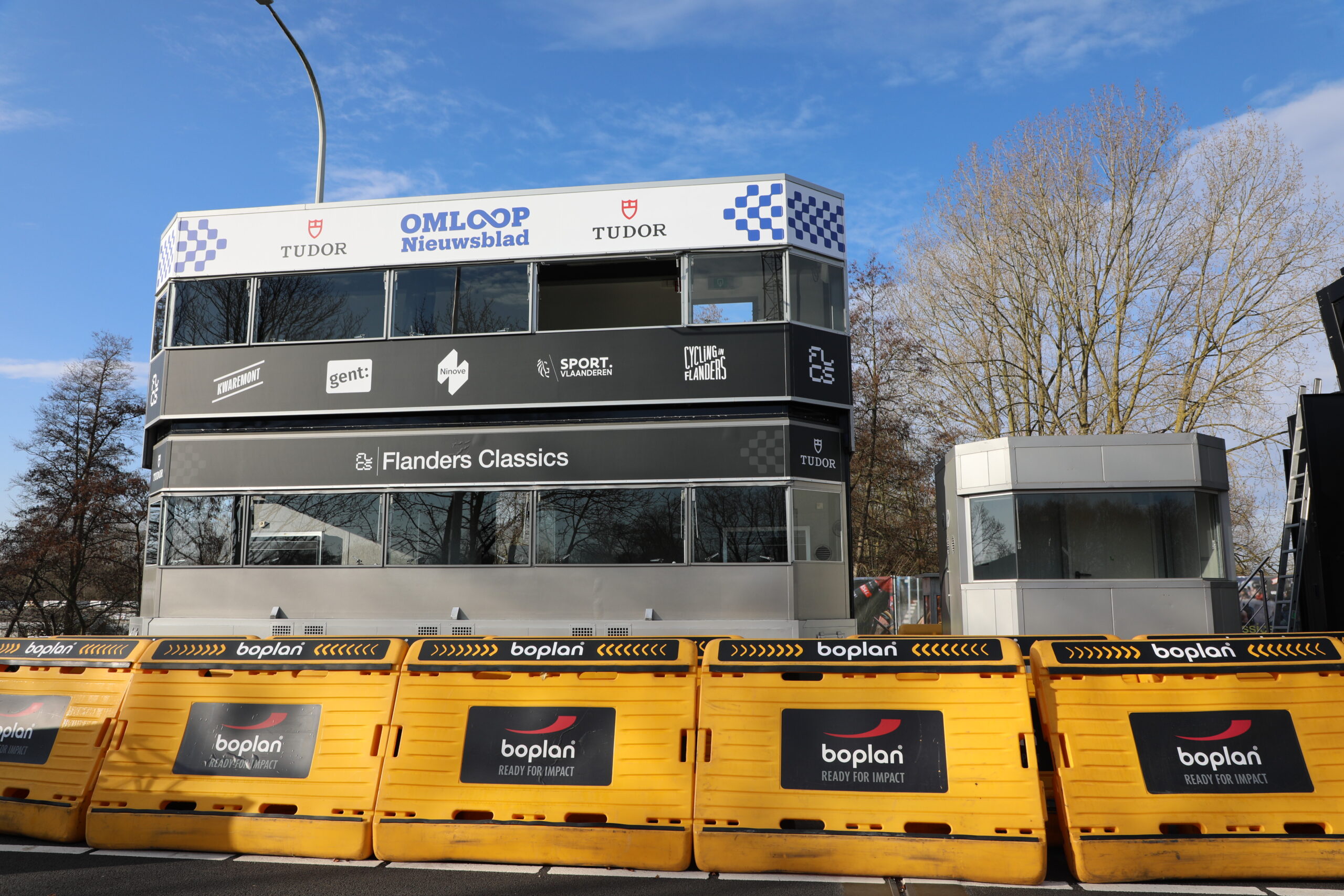 De dranghekken en de gele barrières en bumpers zijn geplaatst, de aankomstboog staat stevig, de lijn is gespoten en de VRT heeft een mediadorp opgetrokken in de laatste rechte lijn.