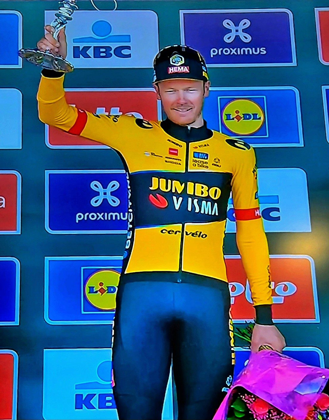 Dylan Van Baarle reed op kousenvoeten weg op een tussenstuk in de heuvelzone en hield het na een sterke solo uit tot aan de finish. In het achtervolgende groepje kon zijn ploegmaat Christophe Laporte in een zetel meeschuiven richting aankomst. Hij moest in de spurt voor de tweede plaats wel de duimen leggen voor een indrukwekkende Arnaud De Lie.
