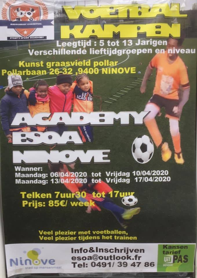 Esoa is gevestigd in Sint-Jans-Molenbeek en bestaat sinds 2013. De sportacademie organiseert ook voetbalstages in Ninove. Als promotie voor voetbalkampen tijdens de paasvakantie in april 2020 op het kunstgrasveld in Pollare, verspreidde ze een affiche. Onderaan stonden de logo’s van de stad Ninove en van UiT-PAS.