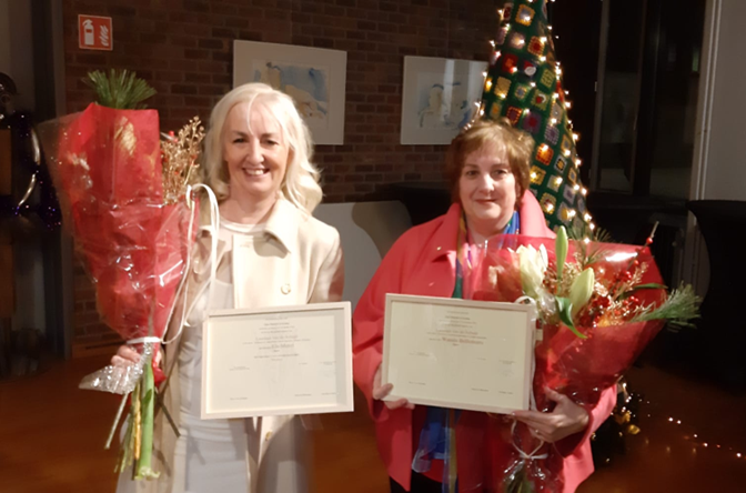 Beide dames kregen een mooie ruiker bloemen, een ingekaderd diploma, een feestelijke fles en een warm applaus.