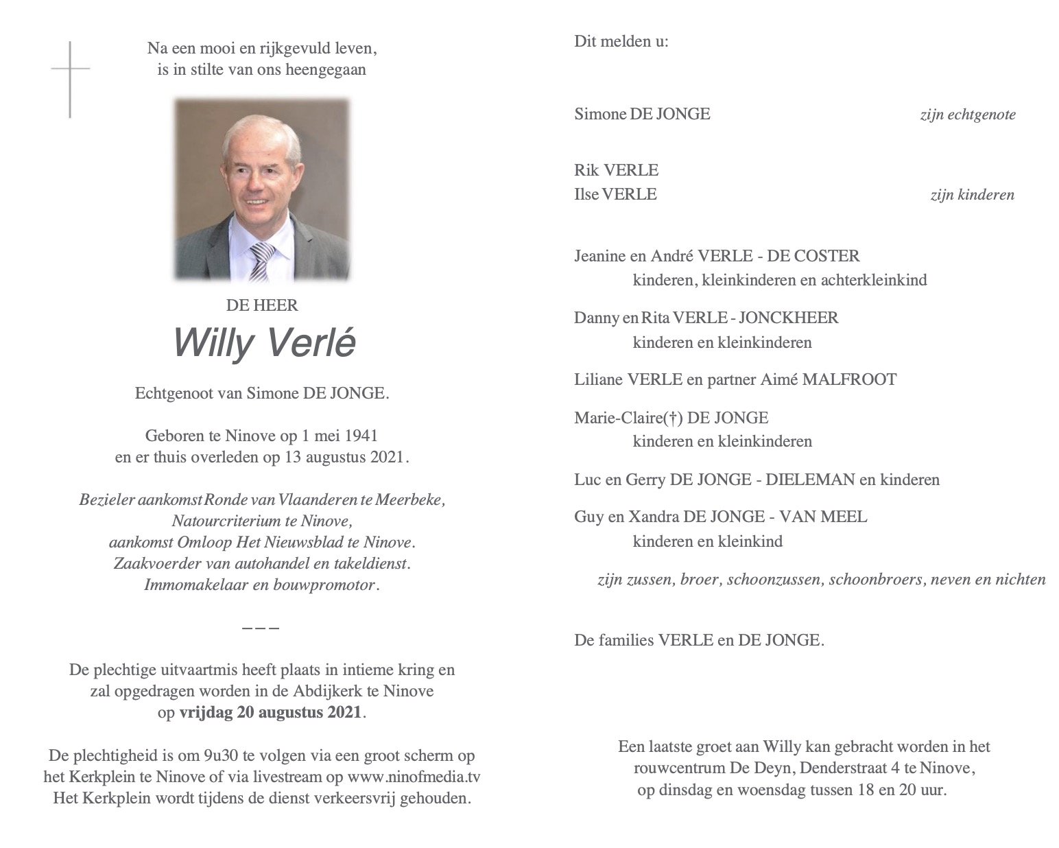 NINOVE – De uitvaartdienst van Willy heeft vrijdag 20 augustus plaats in de Abdijkerk, vanaf 9.30 uur. Ninofmedia brengt deze plechtigheid via de livestream.