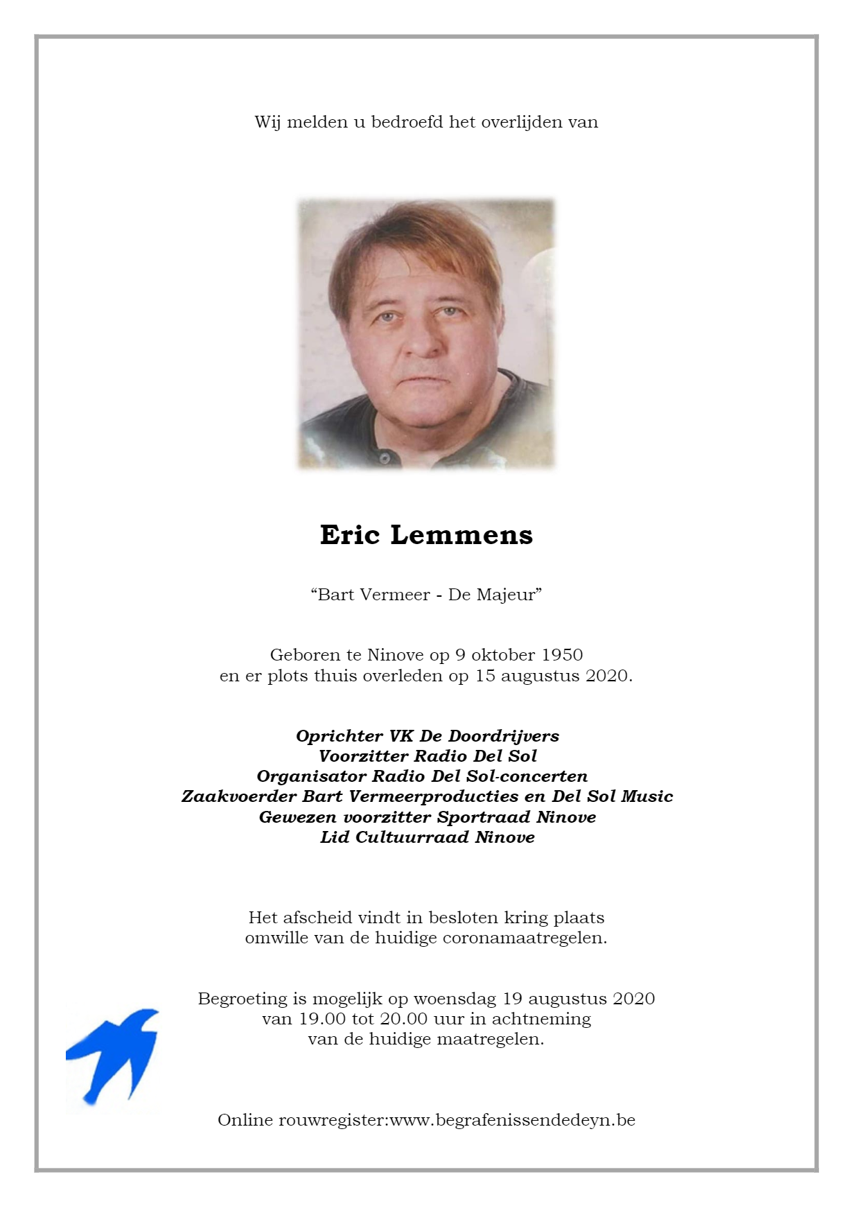 Het afscheid van Eric heeft plaats in beperkte kring.