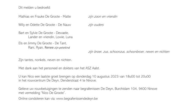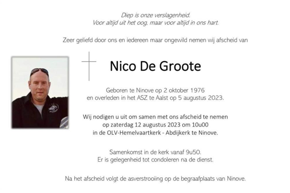 De begrafenis van Nico De Groote heeft zaterdag 12 augustus om 10 uur plaats in de Onze-Lieve-Vrouw-Hemelvaartkerk (Abdijkerk) van Ninove. Na de uitvaart volgt de asverstrooiing op de stedelijke begraafplaats.