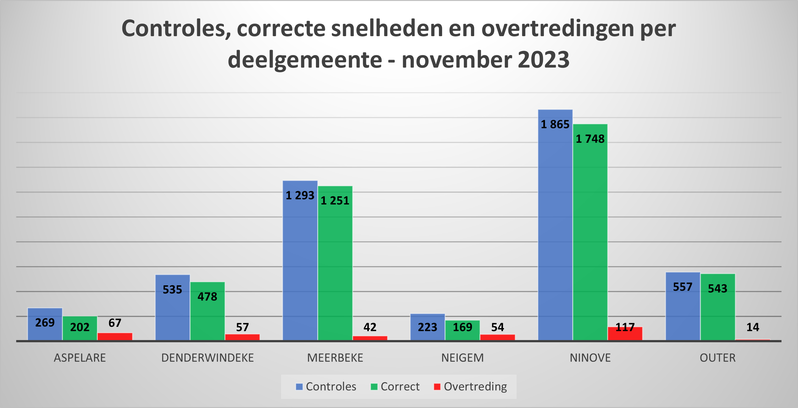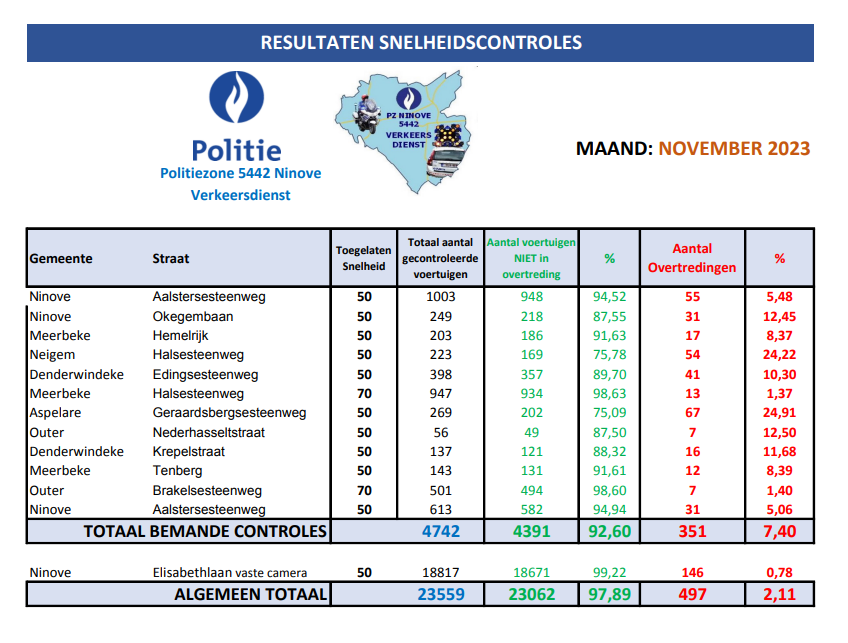 NINOVE – De lokale politie maakte de resultaten bekend van de snelheidscontroles, die ze in november uitvoerde. Net als in augustus en oktober noteerde de verkeerseenheid op de Geraadsbergsesteenweg (Aspelare) het hoogste percentage overtredingen: 24,91 %.