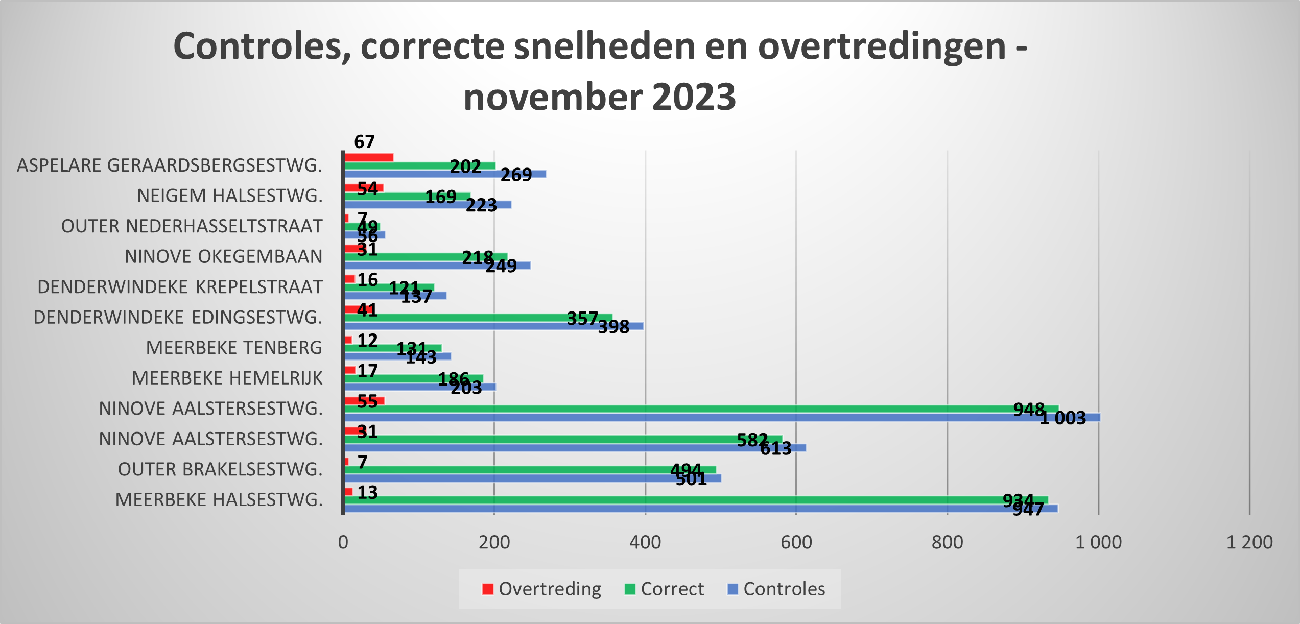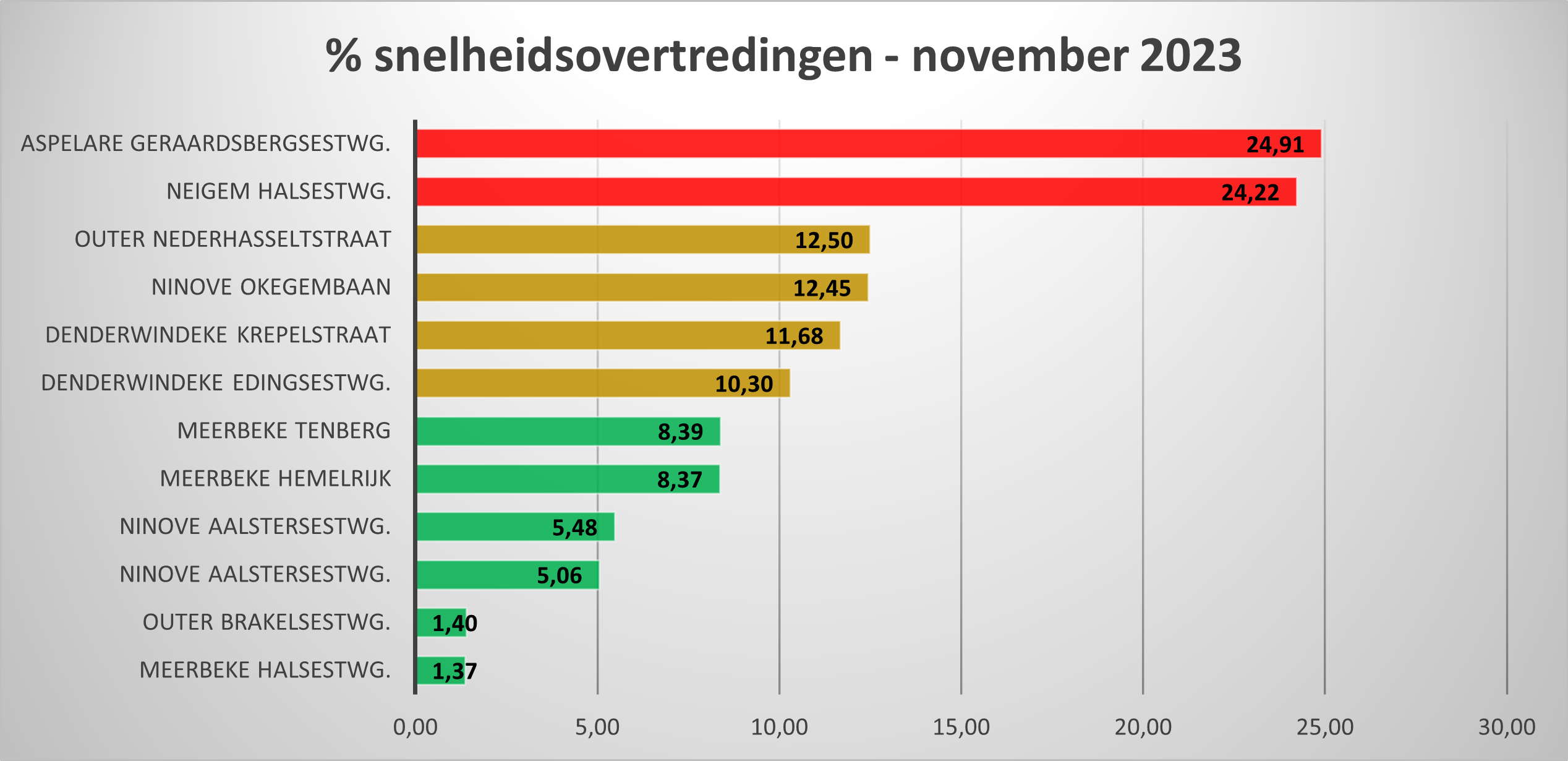 De Geraardsbergsesteenweg in Aspelare en de Halsesteenweg in Neigem haalden de hoogste percentages snelheidsovertredingen met respectievelijk 24,91 % en 24,22 %. Op die meetplaatsen is 50 km/uur de norm.