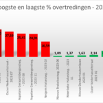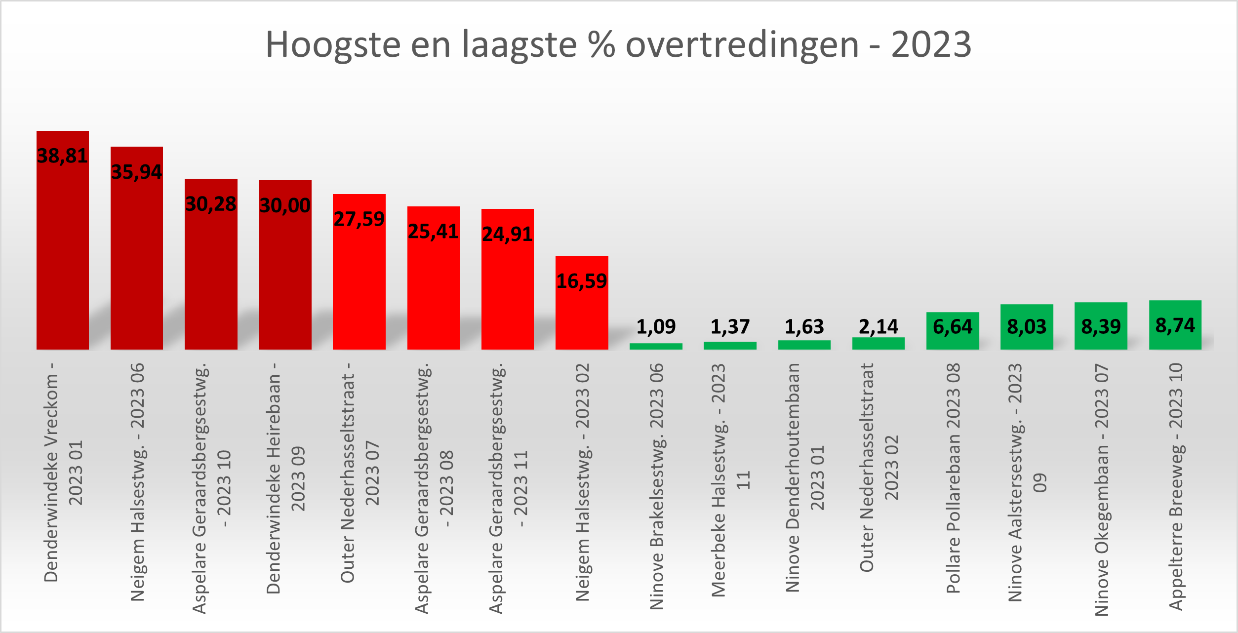 De laagste percentages overtredingen zijn genoteerd op de Halsesteenweg in Meerbeke en de Brakelsesteenweg in Outer met respectievelijk 1,37 % en 1,40 %. Op de beide meetplaatsen bedraagt de maximaal toegelaten snelheid 70 km/uur.