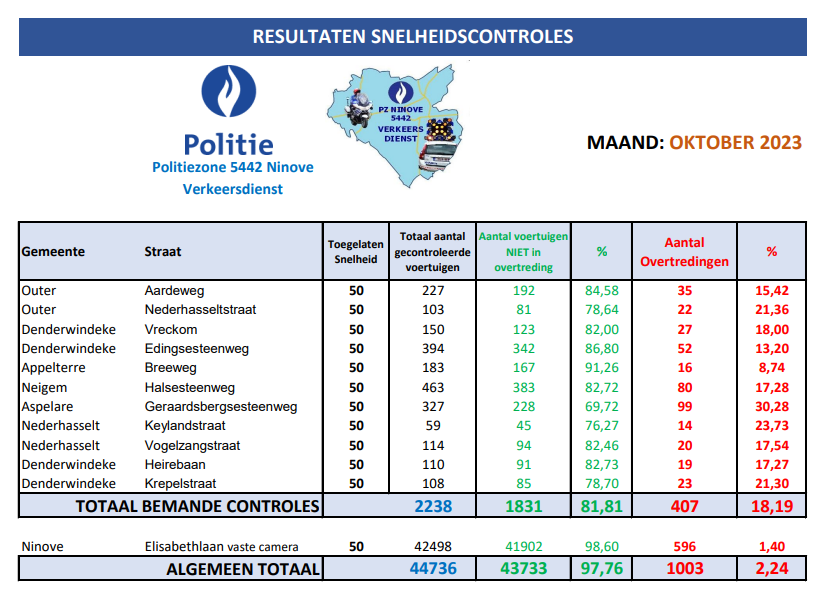 NINOVE – De verkeerseenheid van de lokale politie publiceerde de resultaten van de snelheidscontroles in oktober.