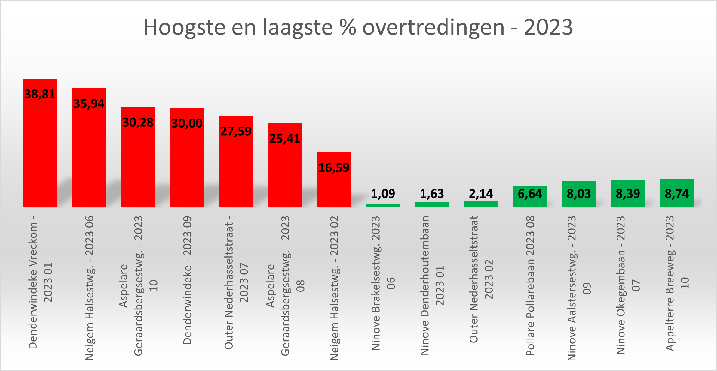 Het laagste percentage overtredingen is genoteerd op de Breeweg in Appelterre-Eichem: 8,74 %.