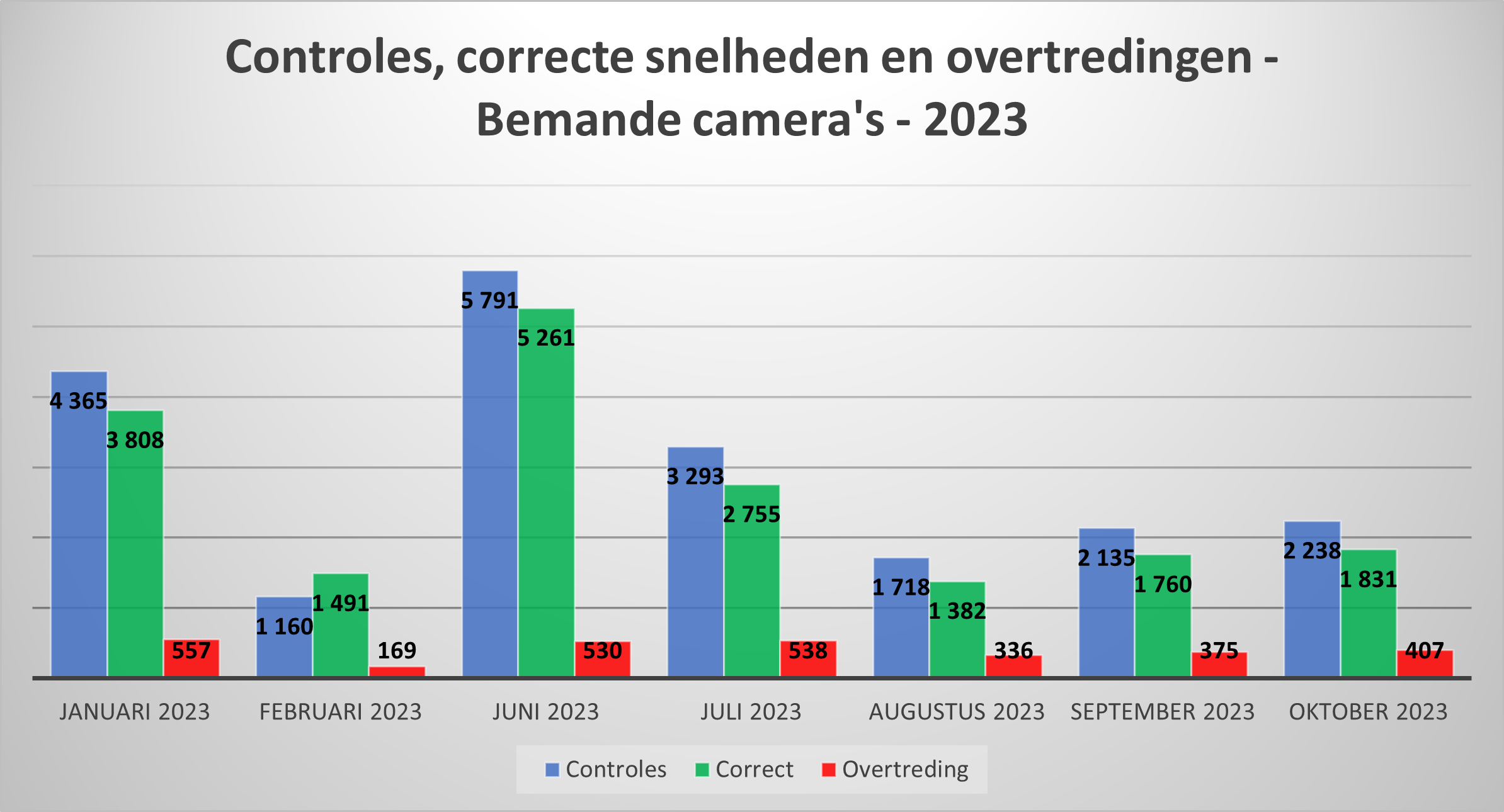 Tijdens de controles met de bemande camera reden 2.238 voertuigen voorbij. Daarbij hielden 1.831 chauffeurs (81,81 %) zich aan de toegelaten snelheid van 50 km/uur..