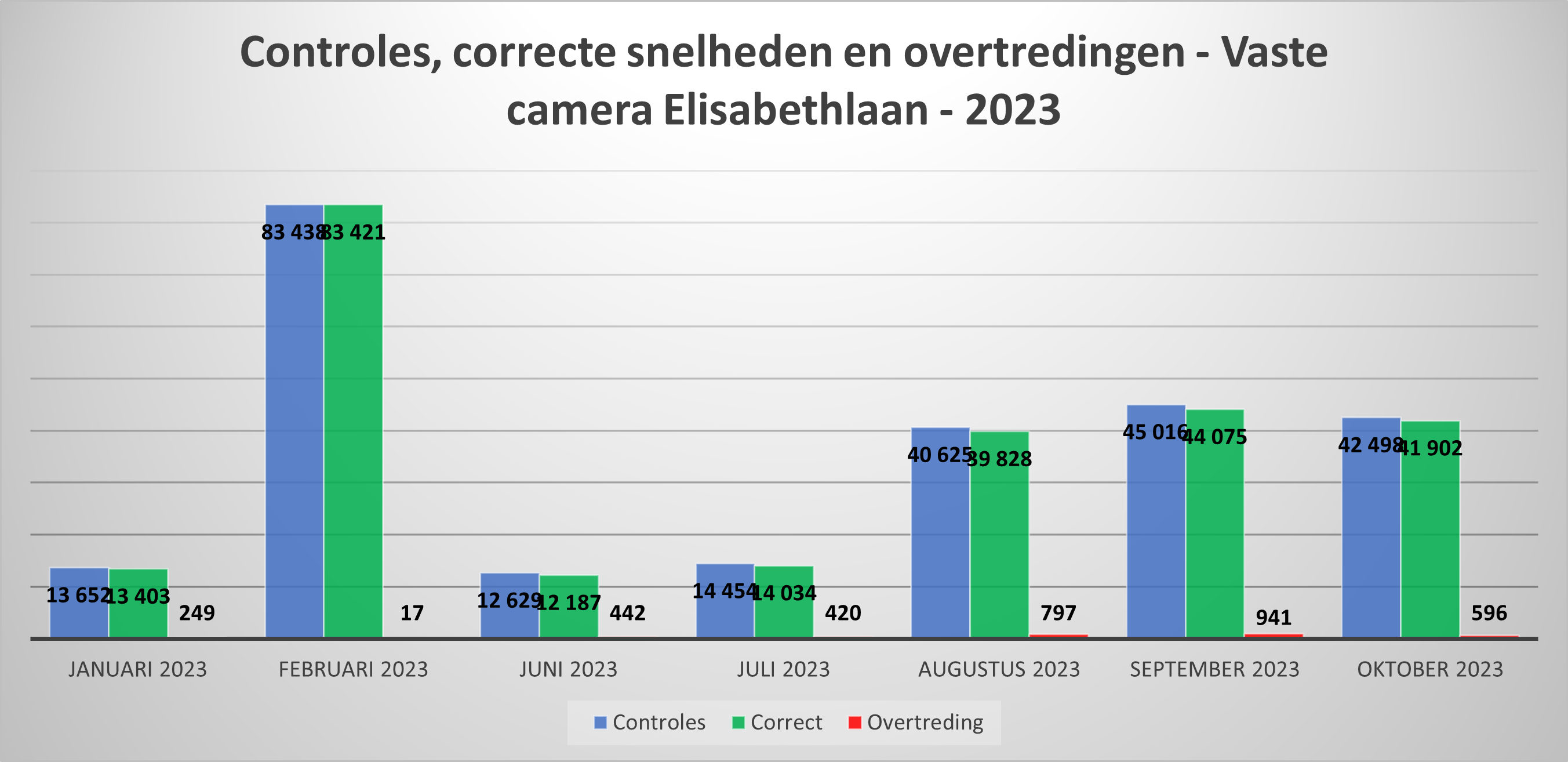 Langs de vaste flitsinstallatie aan de Elisabethlaan passeerden vorige maand 42.498 voertuigen. Daar bedroeg het aantal overtredingen amper 596 (1,40 %).