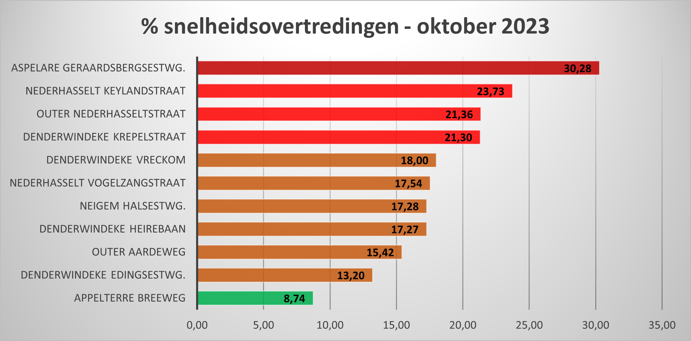 De Geraardsbergsesteenweg in Aspelare en de Keylandstraat in Nederhasselt haalden de hoogste percentages snelheidsovertredingen met respectievelijk 30,28 % en 23,73 %.
