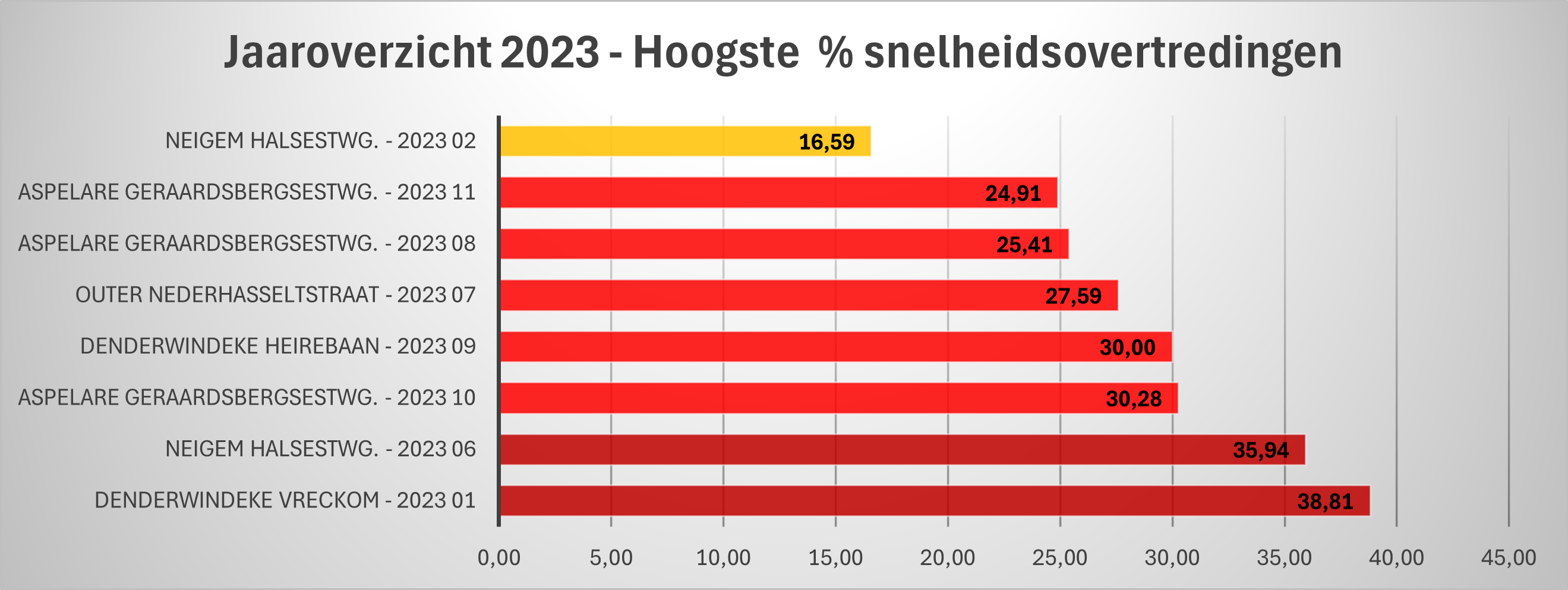In Denderwindeke zijn vooral de Heirebaan, Vreckom en de Krepelstraat gekend als wegen voor laagvliegers. De eerste twee straten lieten vorig jaar respectievelijk 30 % en 38,81 % snelheidsovertredingen noteren. Hemelrijk is wel dichter bebouwd en dus komen ook meer klachten binnen in verband met overdreven snelheid.