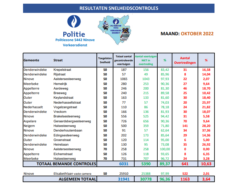 De lokale politie van Ninove publiceerde het overzicht van de snelheidscontroles in oktober. De bemande camera’s controleerden 6.031 voertuigen. 5.390 chauffeurs (89.37 %) hielden zich aan de toegelaten snelheid.