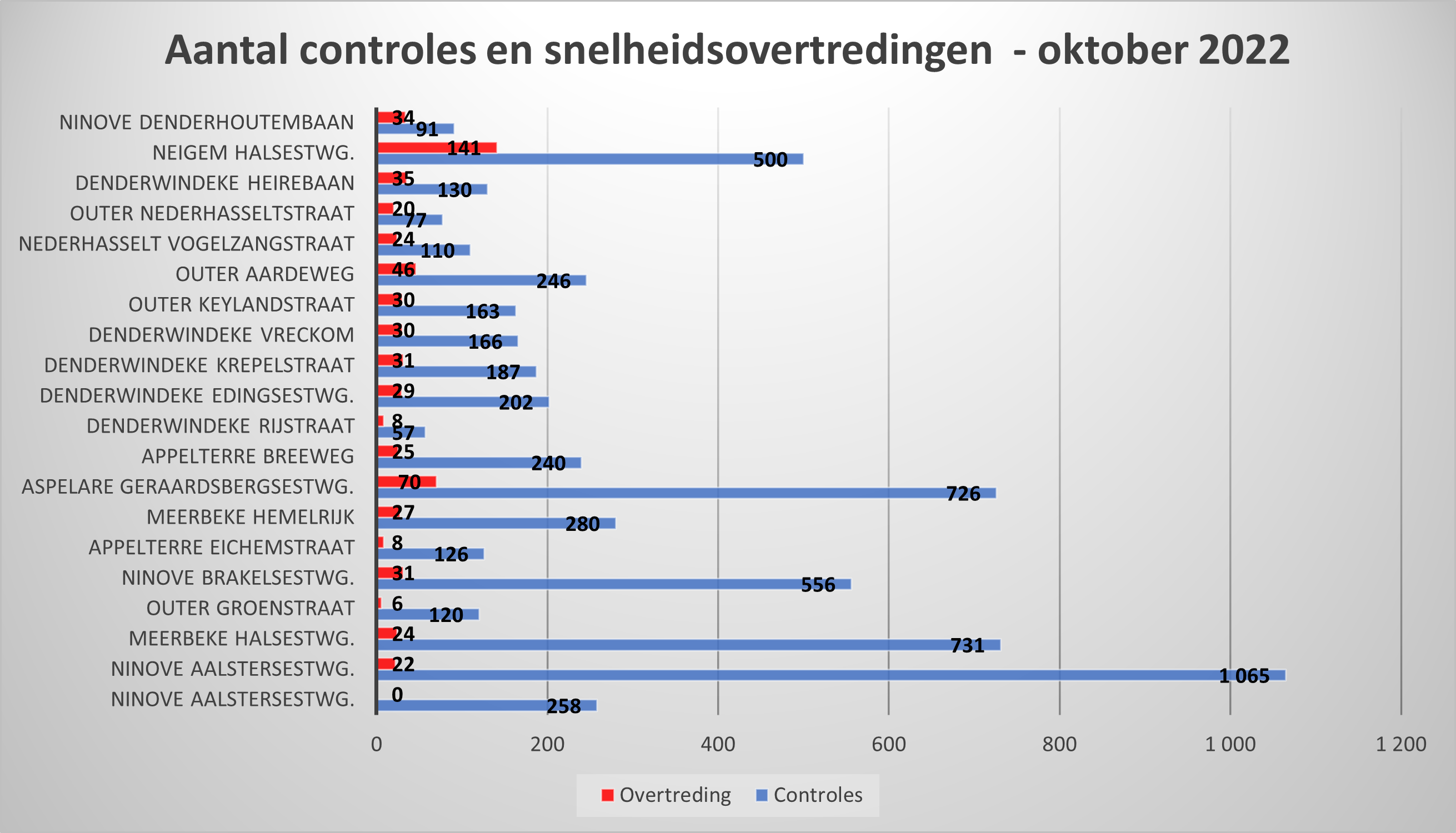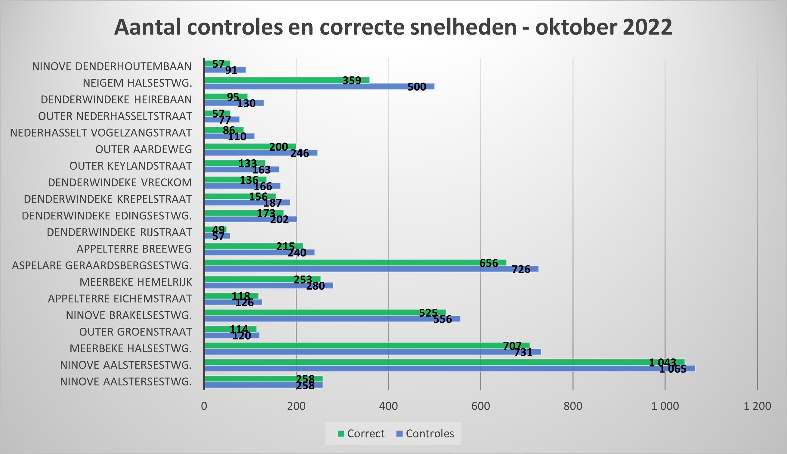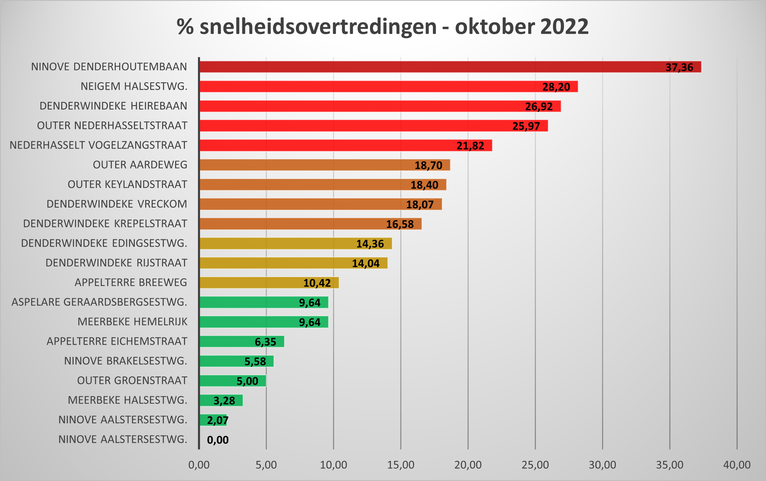 In Ninove zijn zowel het hoogste als het laagste percentage snelheidsovertredingen genoteerd: respectievelijk op de Denderhoutembaan (37.36 %) en de Aalstersesteenweg (zone 70 km/uur – 0,00 %). Dat laatste moet uniek zijn in de metingen van de afgelopen jaren.