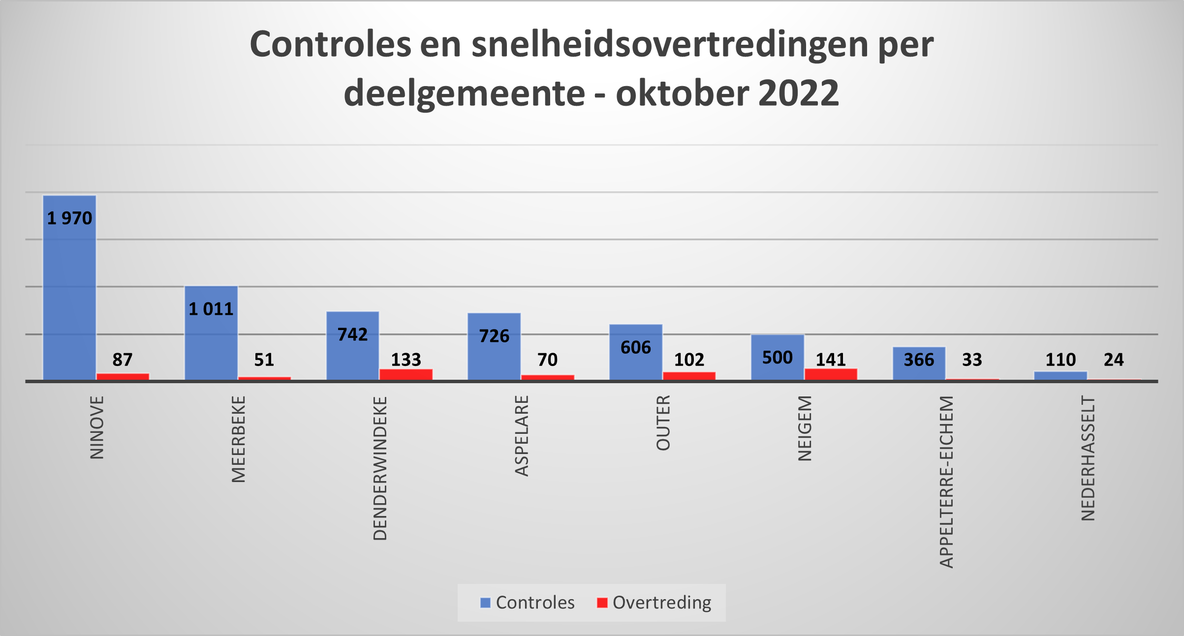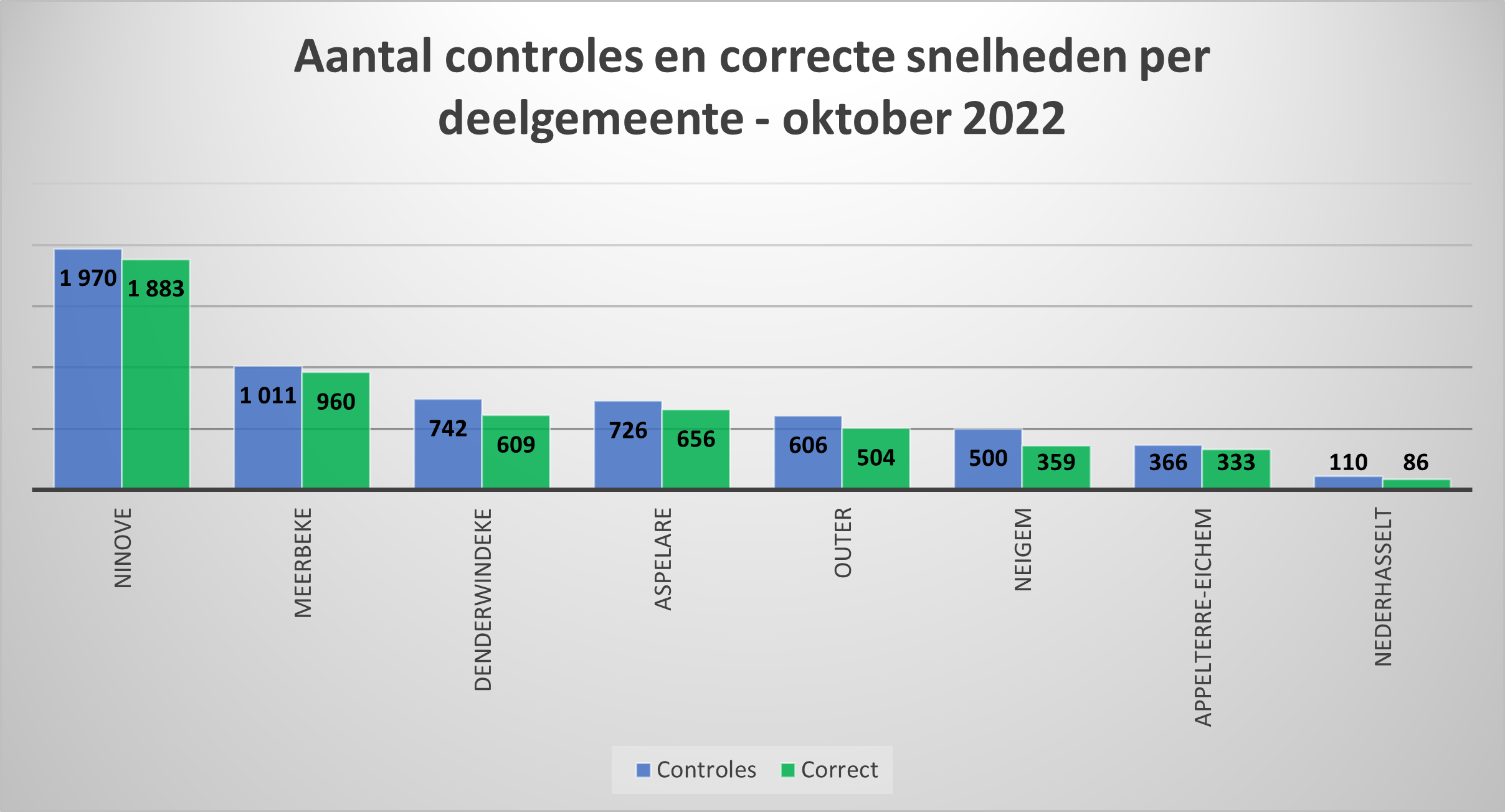 De meeste controles vonden plaats in Ninove (1.970) en Meerbeke (1.011); de minste in Appelterre-Eichem (366) en Nederhasselt (110). In Lieferinge, Okegem, Pollare en Voorde hadden geen controles plaats.