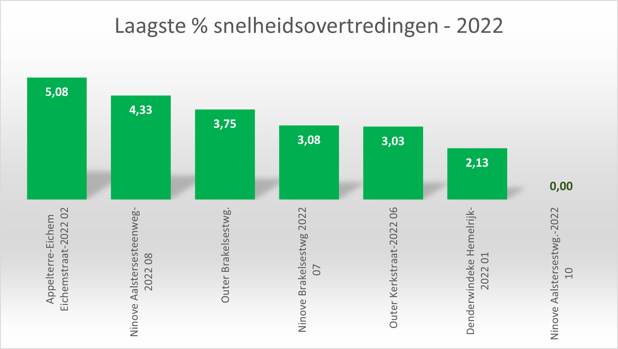Lage percentages snelheidsovertredingen zijn genoteerd in Ninove op de Aalstersesteenweg (gedeelte 50 km/uur – 2,07 %), in Meerbeke op de Halsesteenweg (3,28 %) en in Outer in de Groenstraat (5,00 %).