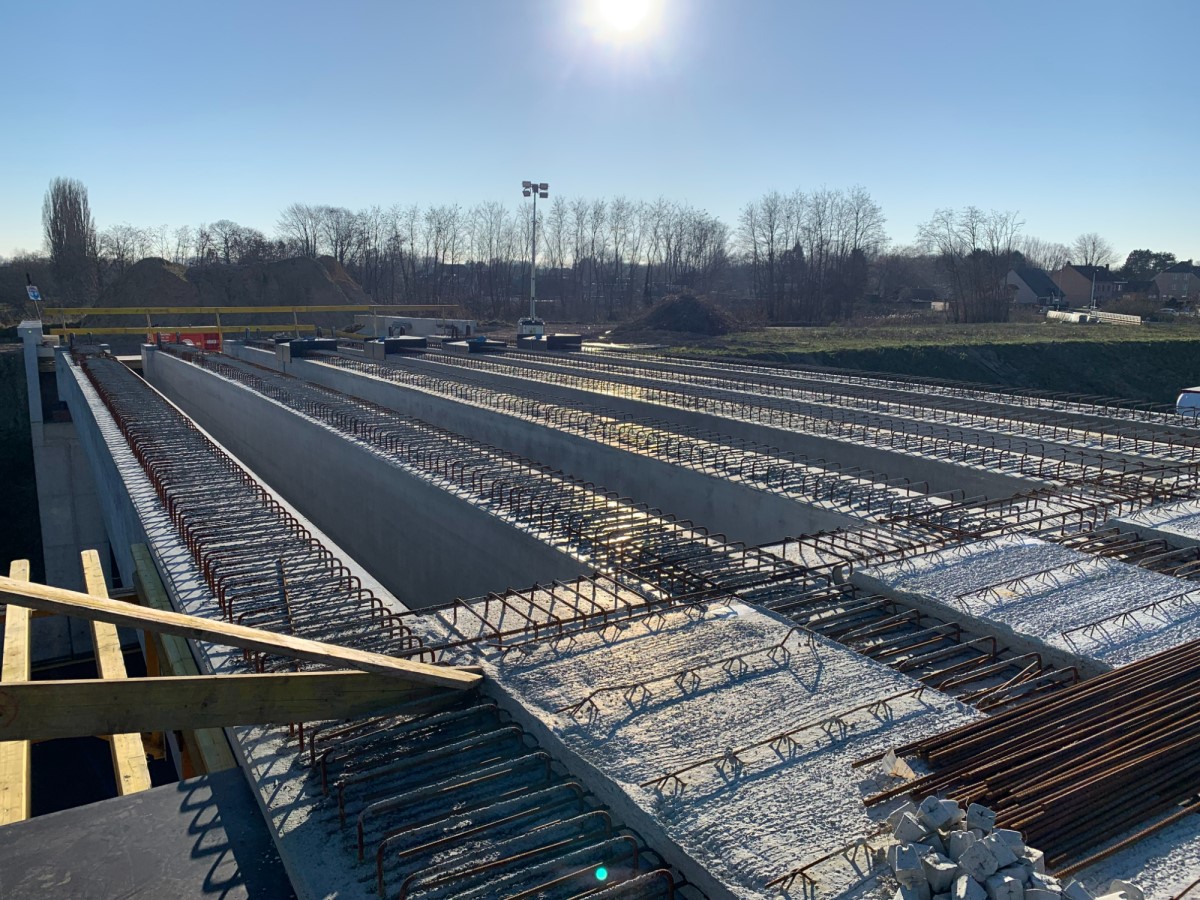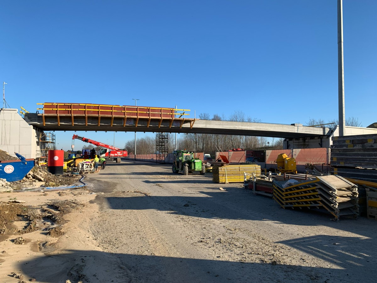 Nu komen hierop betonnen platen om ze met elkaar te verbinden en de basis te vormen van het brugdek. Elke plaat is zo’n 1,5 meter breed en 3 meter lang. Daarnaast wordt ook al de randbekisting van de brug geplaatst om de komende maanden veilig verder te werken.