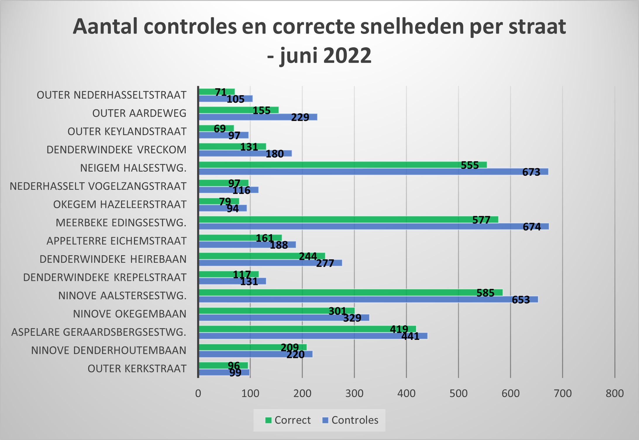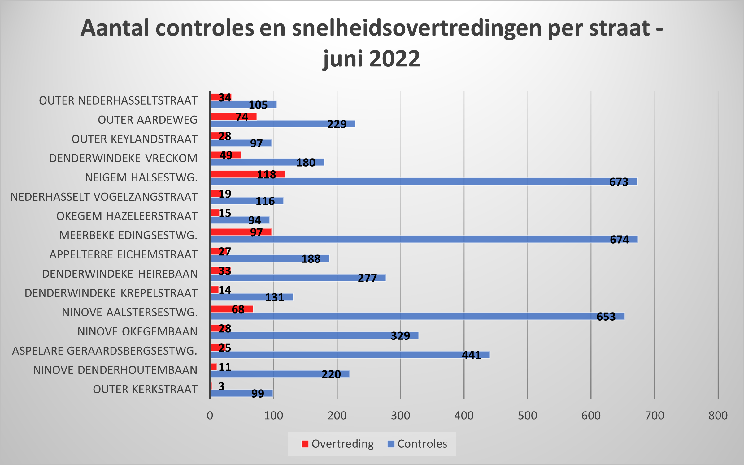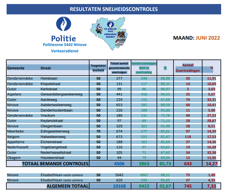 De meeste controleposten stonden opgesteld in Ninove (1.202), Meerbeke (674) en Neigem (673). In Lieferinge, Pollare en Voorde hadden in juni geen snelheidscontroles plaats.