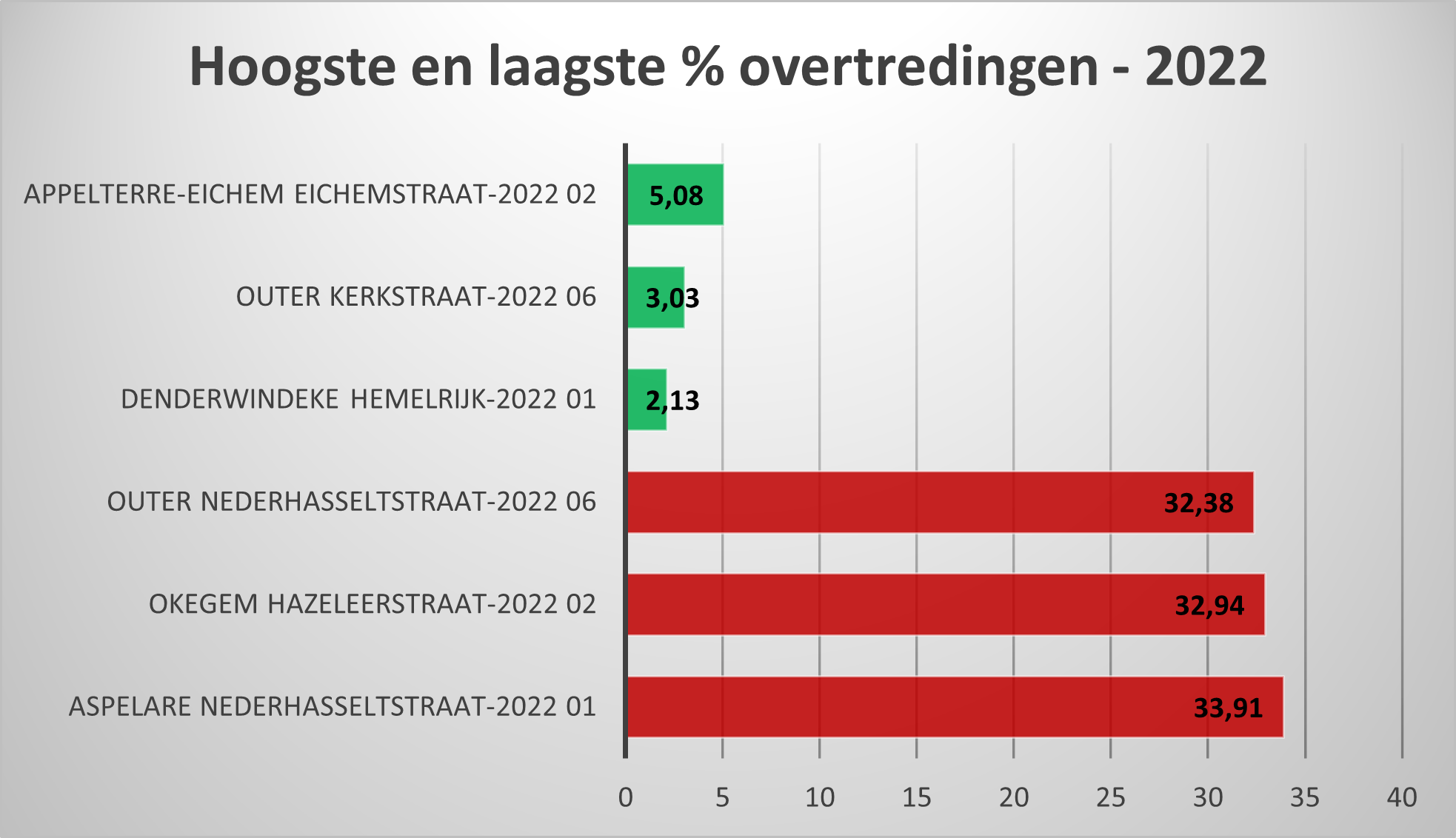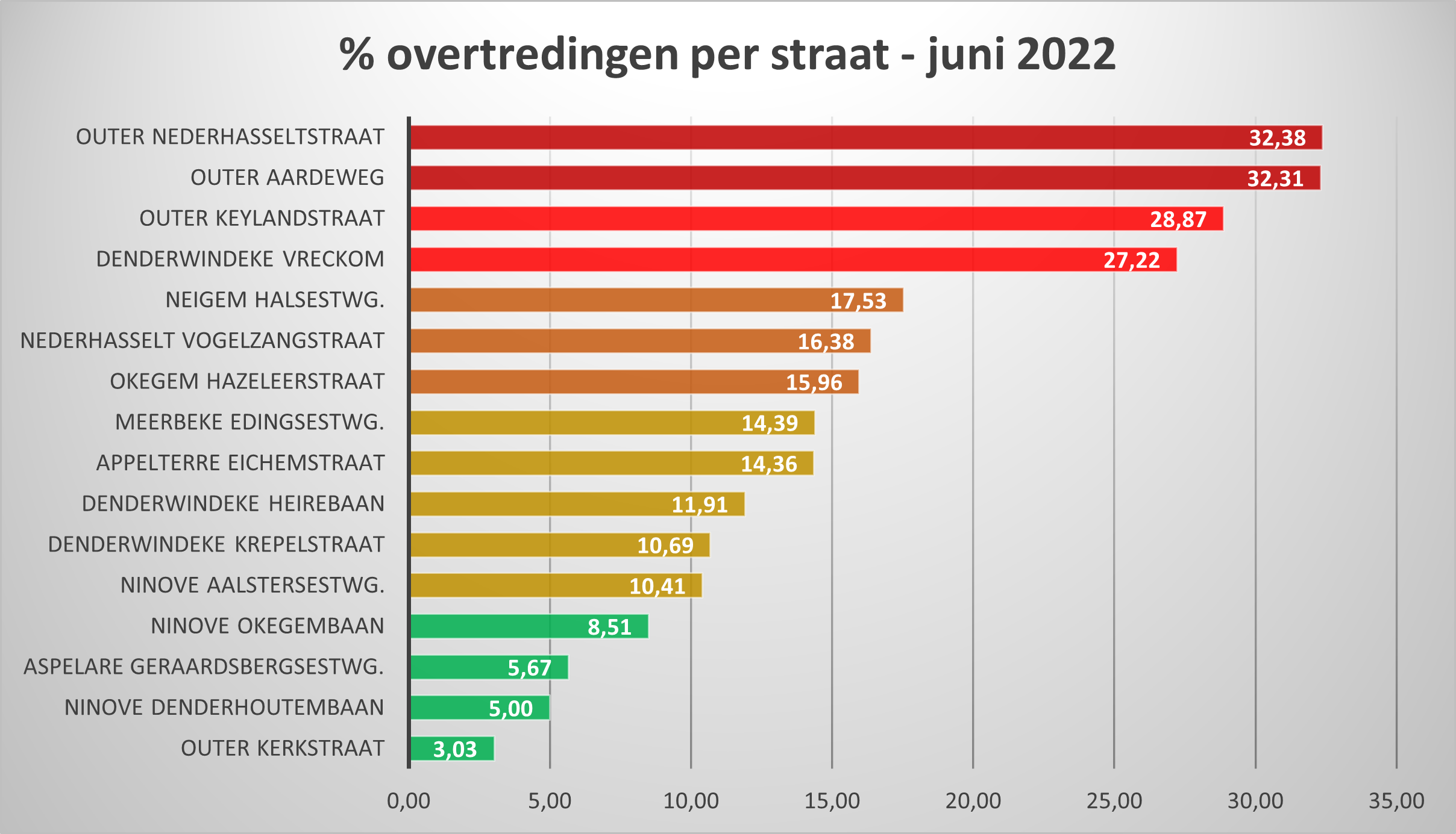 NINOVE – De lokale politie maakte de resultaten bekend van de snelheidscontroles in juni 2022. Outer scoorde slecht met de Nederhasseltstraat (32,38 %), de Aardeweg (32,31 %) en de Keylandstraat (28,87 %) in de ‘top 3’. Maar ook in Outer is het laagste percentage opgetekend: 3,03 % in de Kerkstraat.
