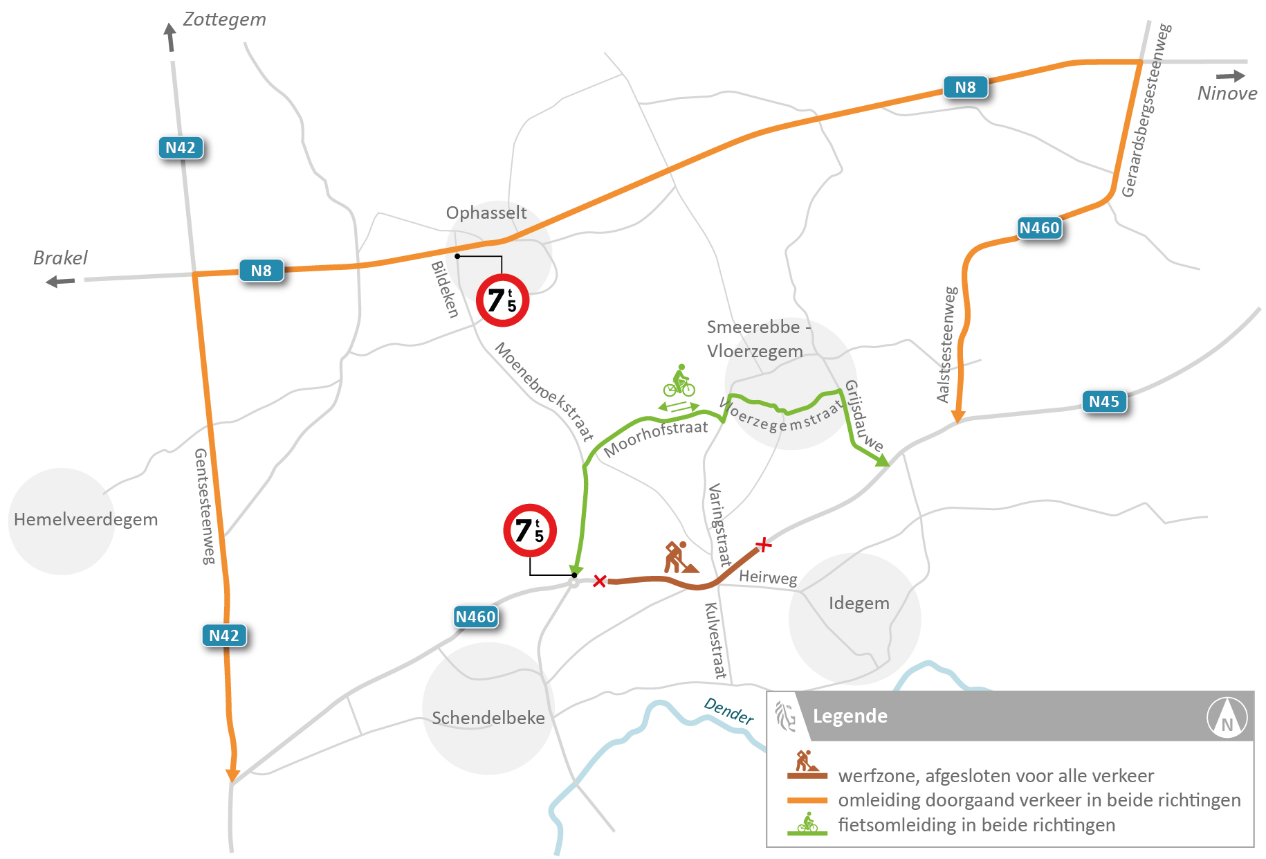 Alle verkeer rijdt in de beide richtingen om via de Gentsesteenweg (N42) en de Brakelsesteenweg (N8). Het lokaal verkeer rijdt in de beide richtingen om via de Moenebroekstraat en Bildeken. In de beide straten geldt een tonnagebeperking van 7,5 ton.