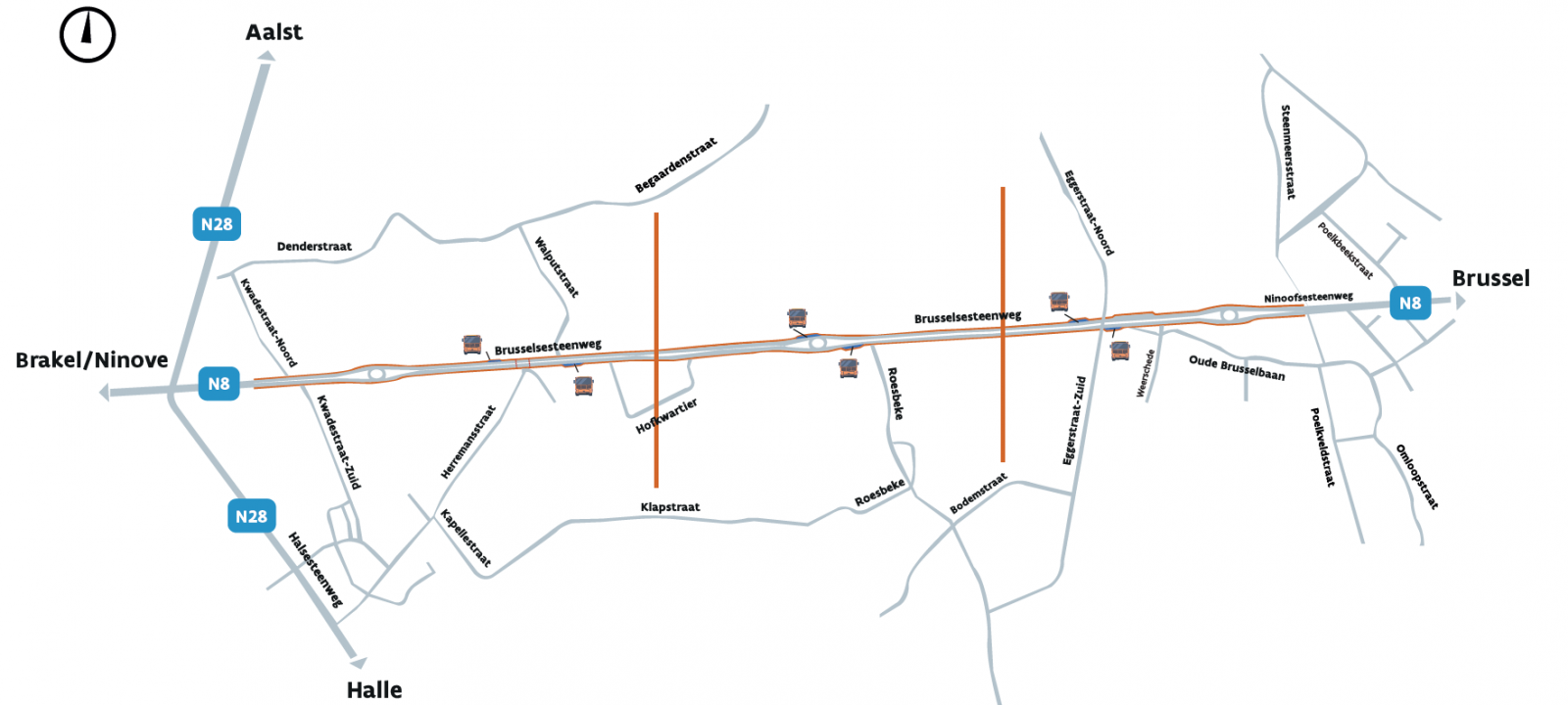 Voor de herinrichting van de Brusselsesteenweg/N8 zijn 149 innames gerealiseerd en blijft het aantal ingenomen huizen op 52. Er is al € 12.644.360 betaald voor de gerealiseerde onteigeningen. Het restbudget voor de voortuinstroken zou moeten volstaan. Voor 2023 is de aanbesteding voorzien van de sloopwerken, die effectief in 2024 kunnen gebeuren.