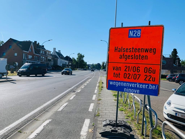 - Tijdens de hele periode van de werken geldt op de Halsesteenweg (N28) een parkeerverbod langs de beide kanten. Die zones dienen voor de opslag van materiaal en machines.