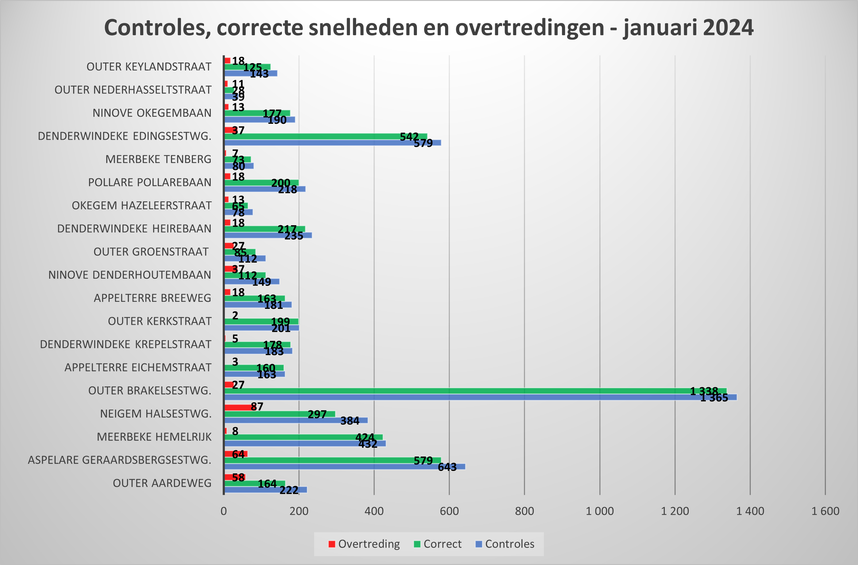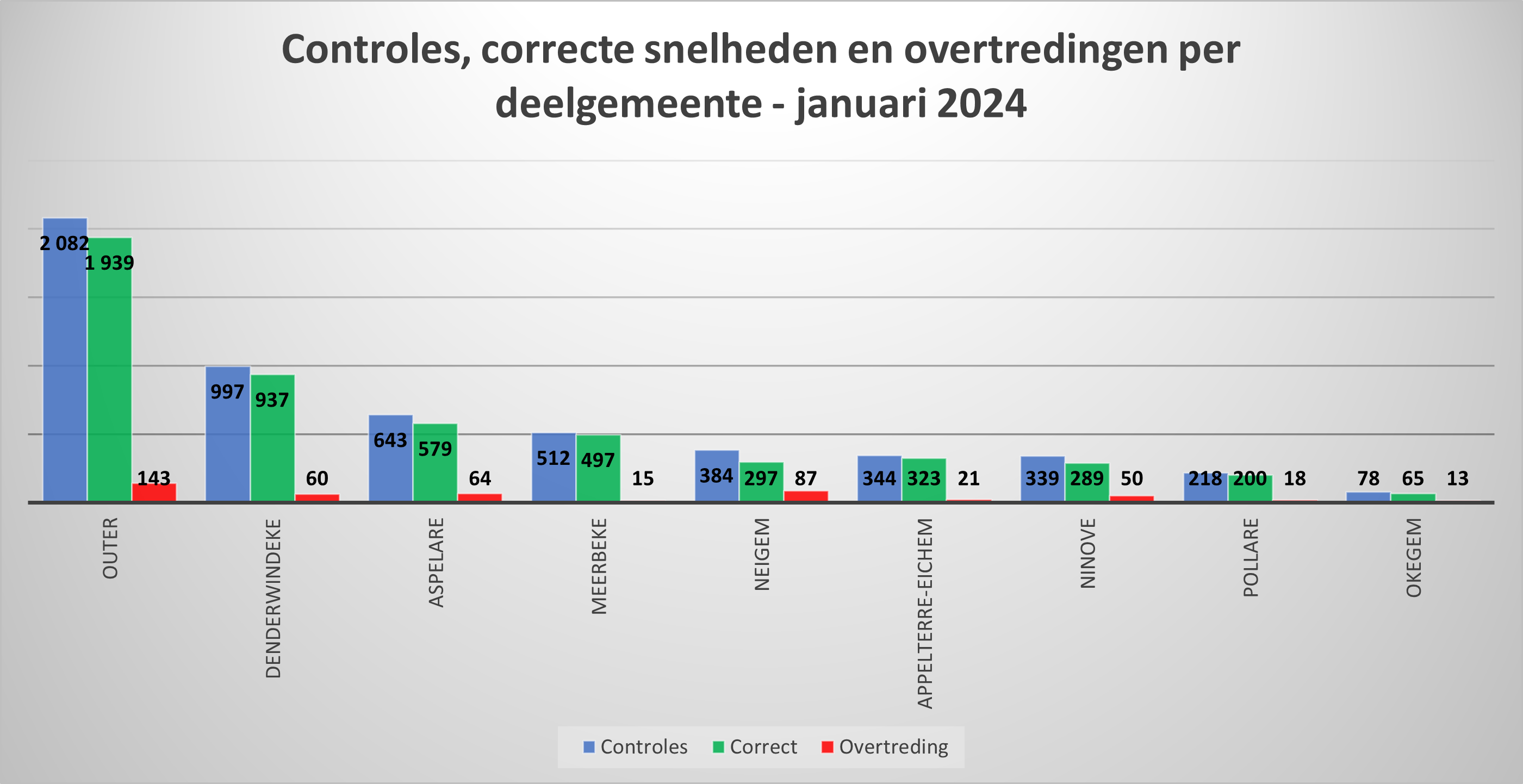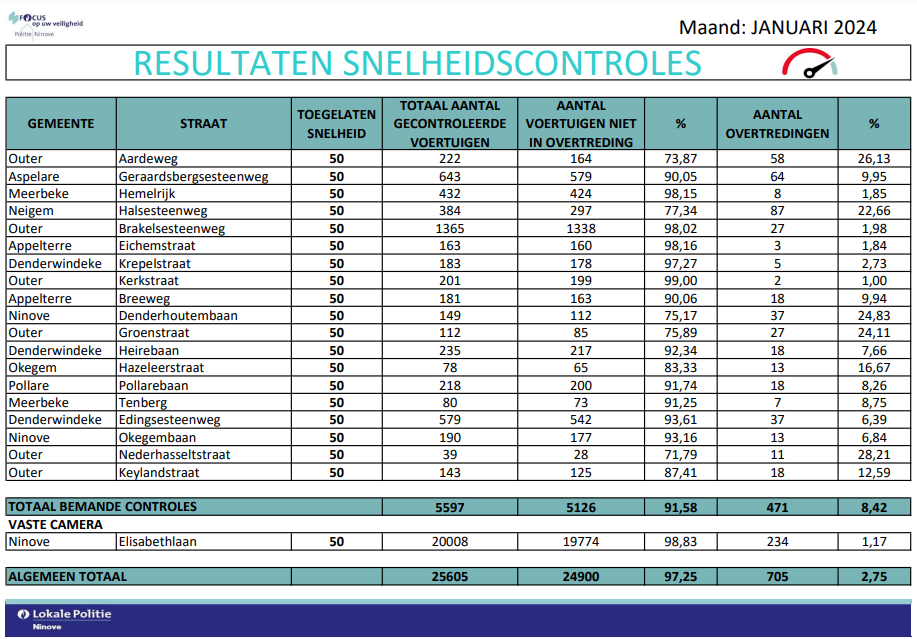 De bemande camera’s noteerden vorig maand 471 snelheidsovertredingen. In Outer hadden de meeste controles plaats (2.082) met hoge percentages aan overtredingen in de Nederhasseltstraat (28,11 %), de Aardeweg (26,13 %) en de Groenstraat (24,11 %). De Denderhoutembaan (24,83 %) in Ninove en de Halsesteenweg (22,66 %) in Neigem completeren de top 5.