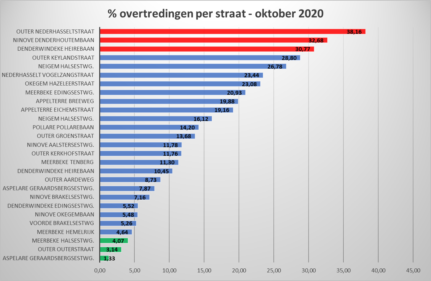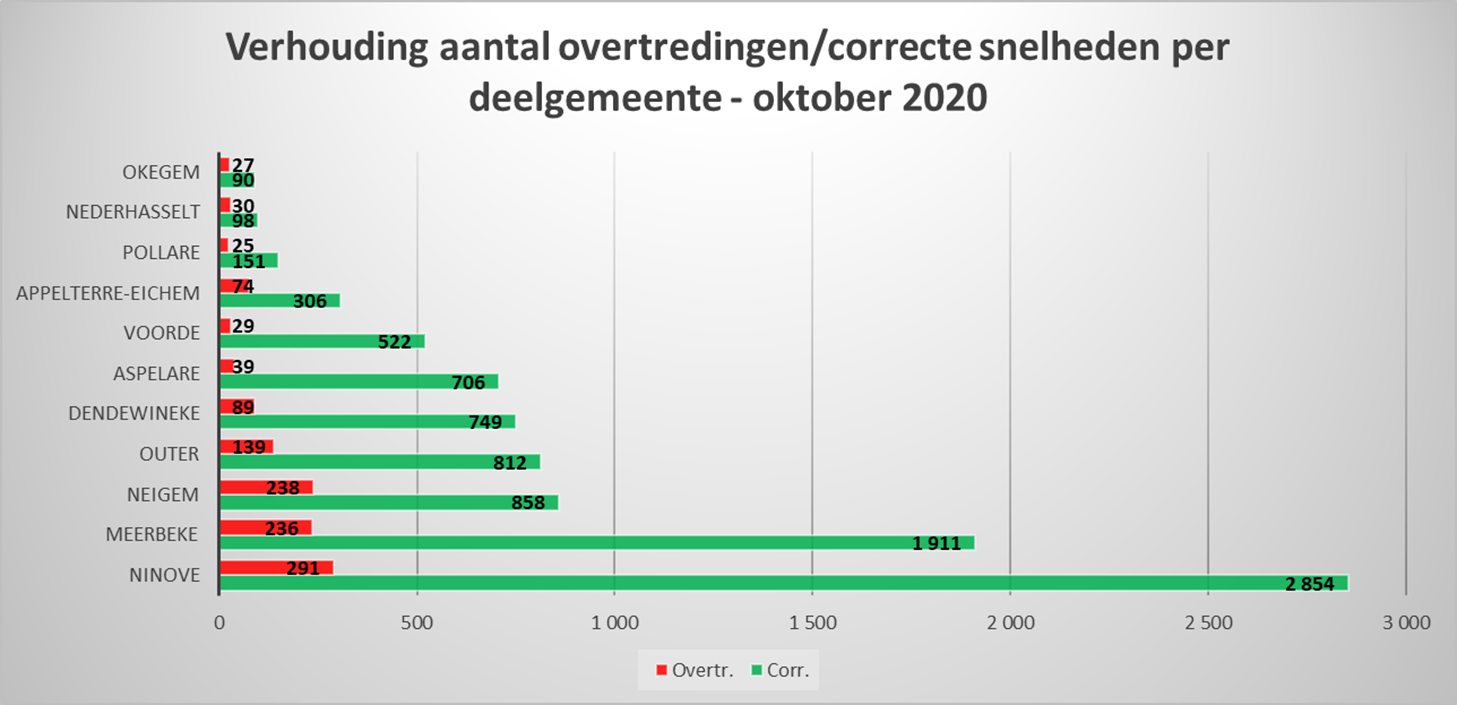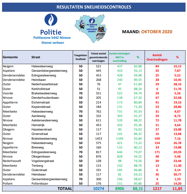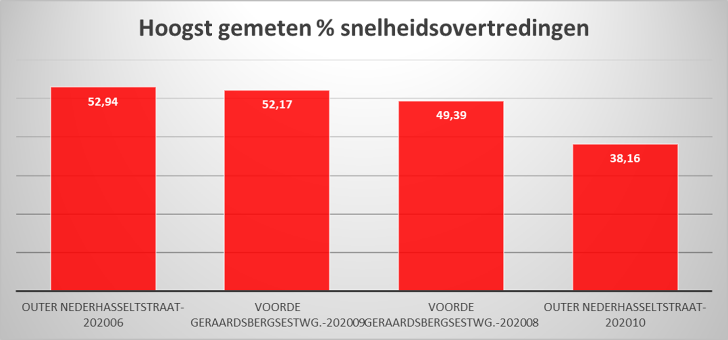 De hoogste percentages overtredingen zijn vastgesteld in de Nederhasseltstraat in Outer (38,16 %), de Denderhoutembaan in Ninove (32,68 %) en de Heirebaan in Denderwindeke (30’77 %).