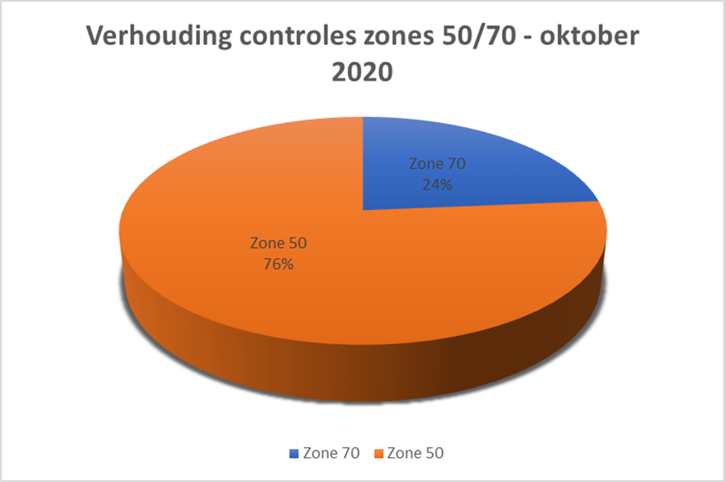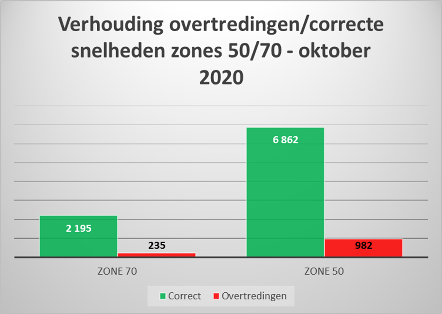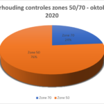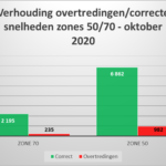 Het grootste aantal controles (76 %) is vastgesteld in de zones 50, net als het aantal correcte snelheden (6.862) en overtredingen (982).