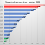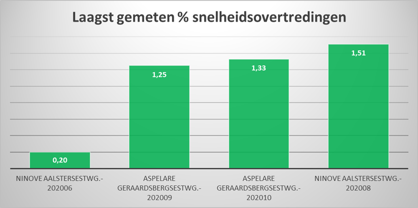 De laagste percentages overtredingen gebeurden op de Geraardsbergsesteenweg in Aspelare (1,33 %), de Outerstraat in Outer (3,14 %) en op de Halsesteenweg in Meerbeke (4,07 %).