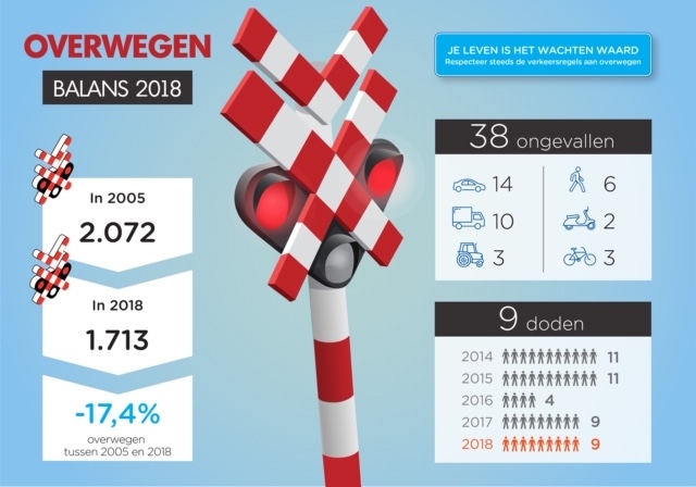 REGIO – Vorig jaar waren er 38 ongevallen aan overwegen (tegenover 51 in 2017) wat een historisch laag cijfer is. Toch blijft het aantal doden (9) hetzelfde als in 2017