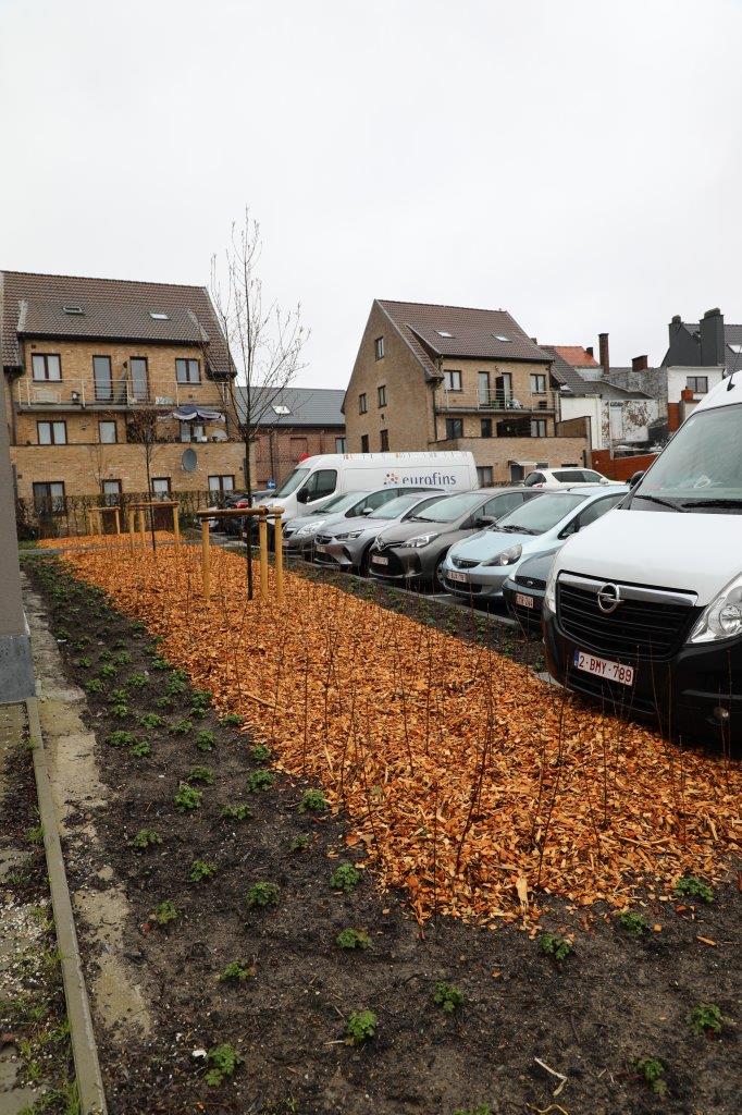 De parking is aangelegd in waterdoorlatende betonstraatstenen, zowel de rijweg als de parkingplaatsen. Dat zijn er nu 22, waarvan één voor personen met een beperking.