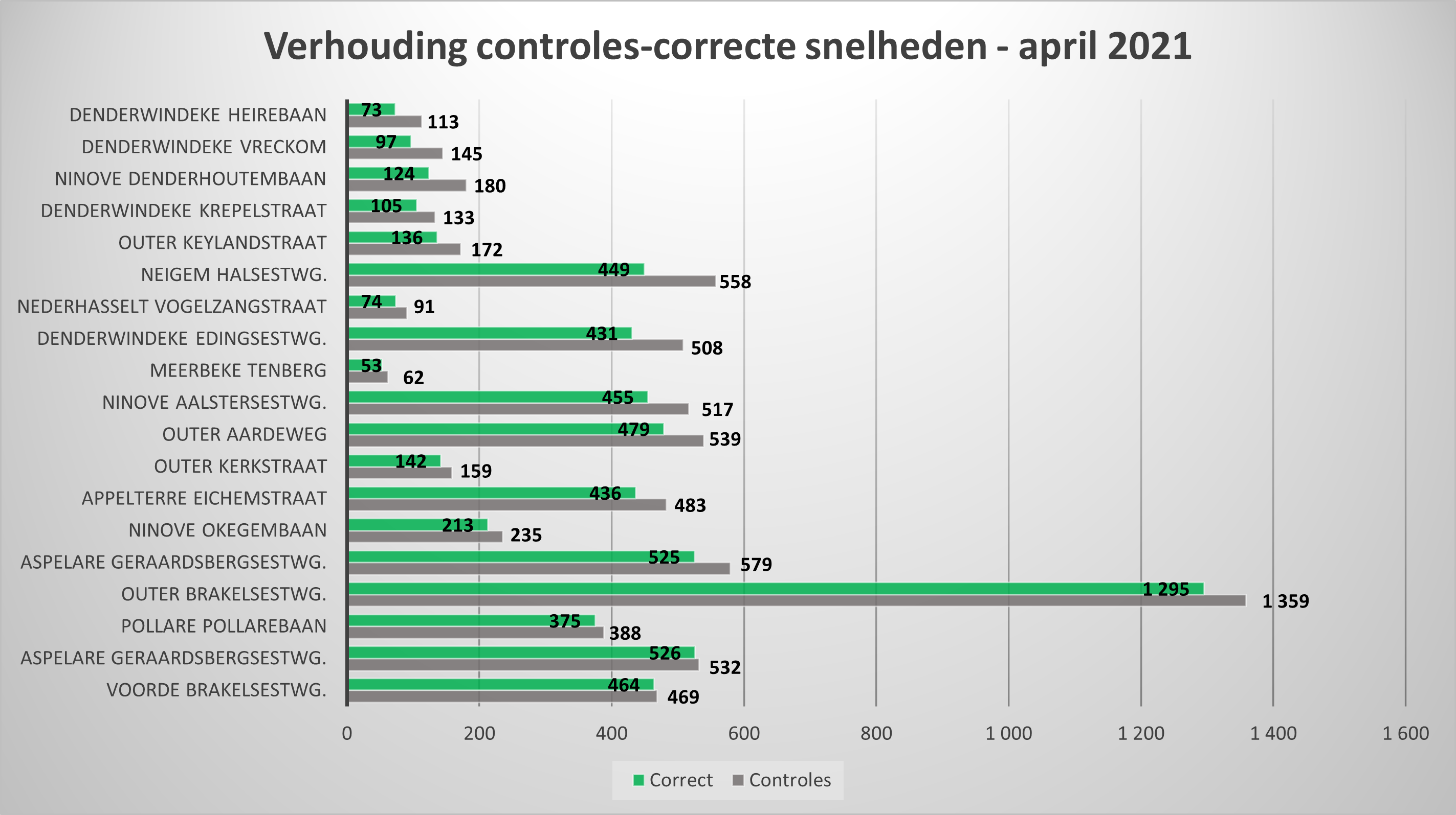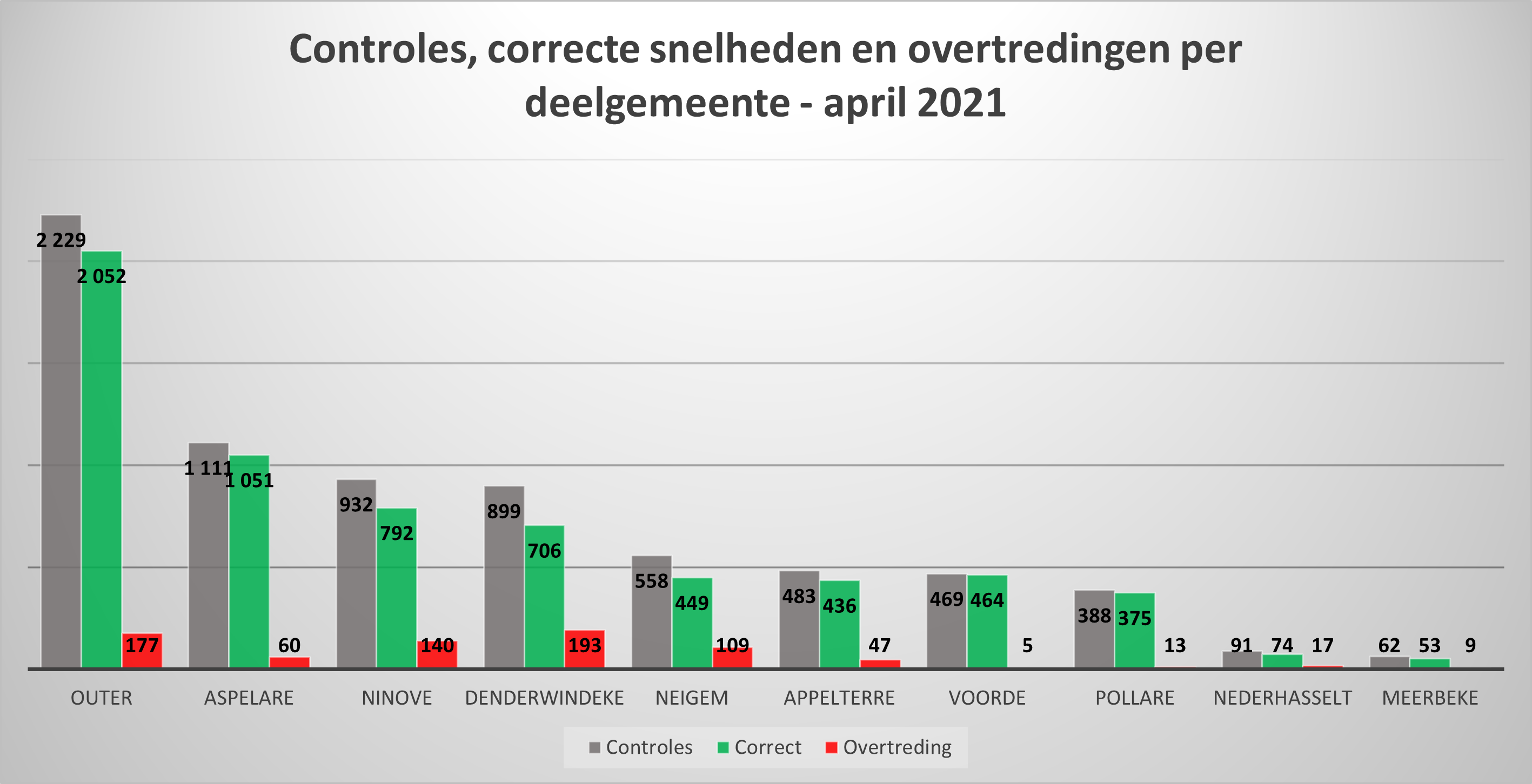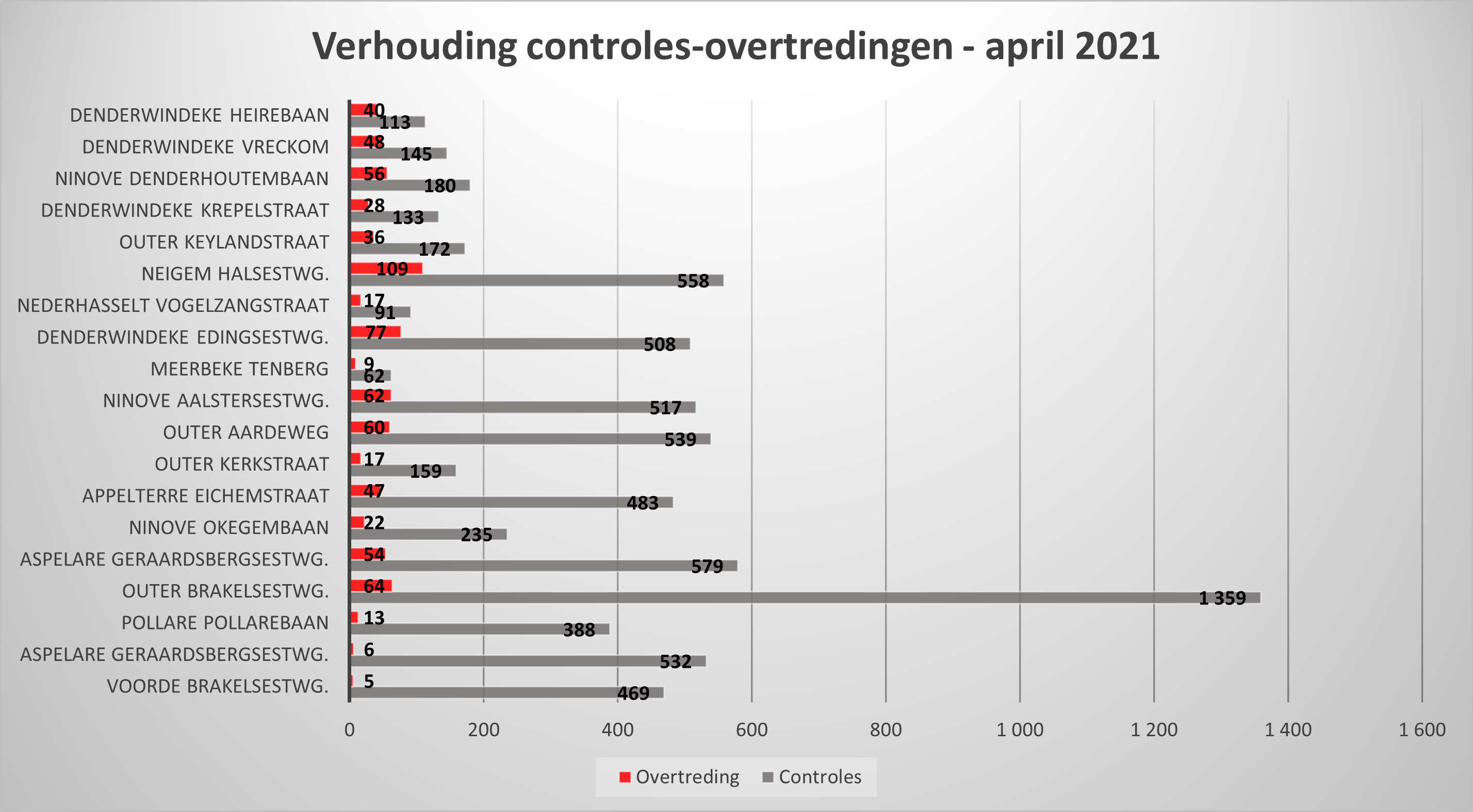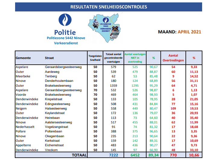 NINOVE – De lokale politie controleerde in april 7.222 voertuigen op snelheid. 89,34 % hield zich aan de maximumsnelheid. De Heirebaan in Denderwindeke (zone 50) liet 35,40 % overtredingen optekenen, net iets hoger dan vorige maand.