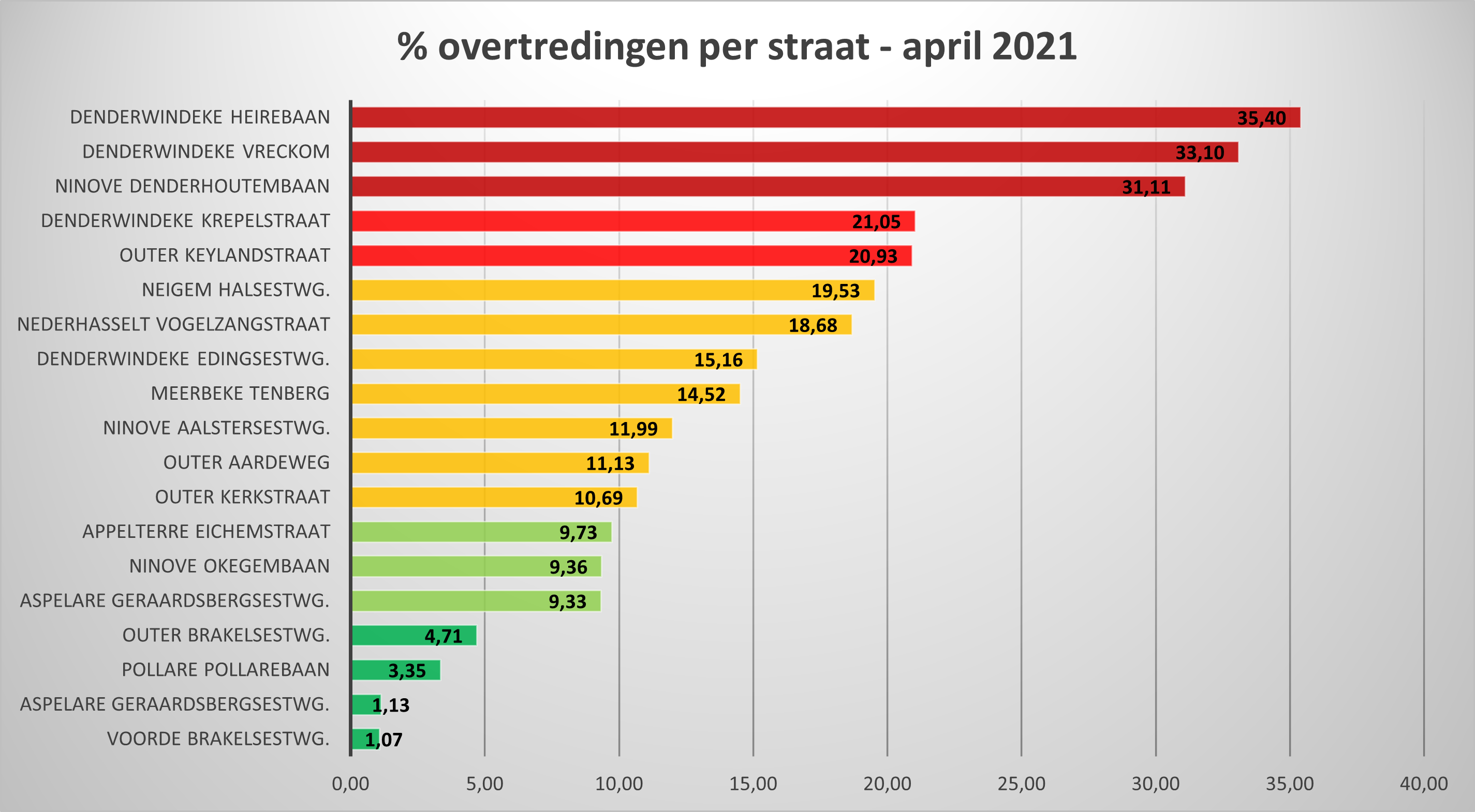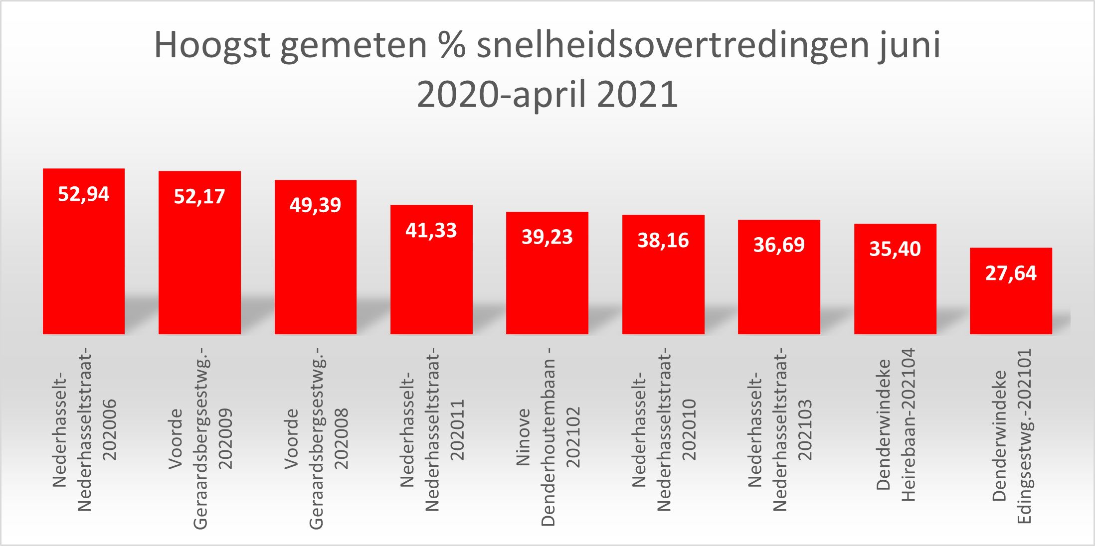 Daarnaast gebeurden nog hoge percentages snelheidsovertredingen op Vreckom in Denderwindeke (33,10 %) en de Denderhoutembaan in Ninove (31,11 %).