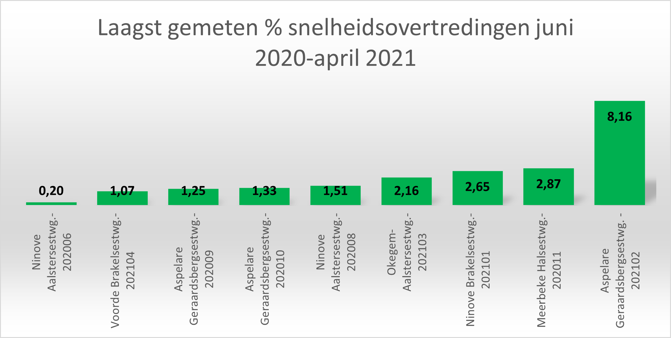 De lagere percentages zij opgetekend op de Geraardsbergsesteenweg in Aspelare (1,13 %), de Pollarebaan in Pollare (3,35 %) en de Brakelsesteenweg in Outer (4,71 %).