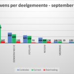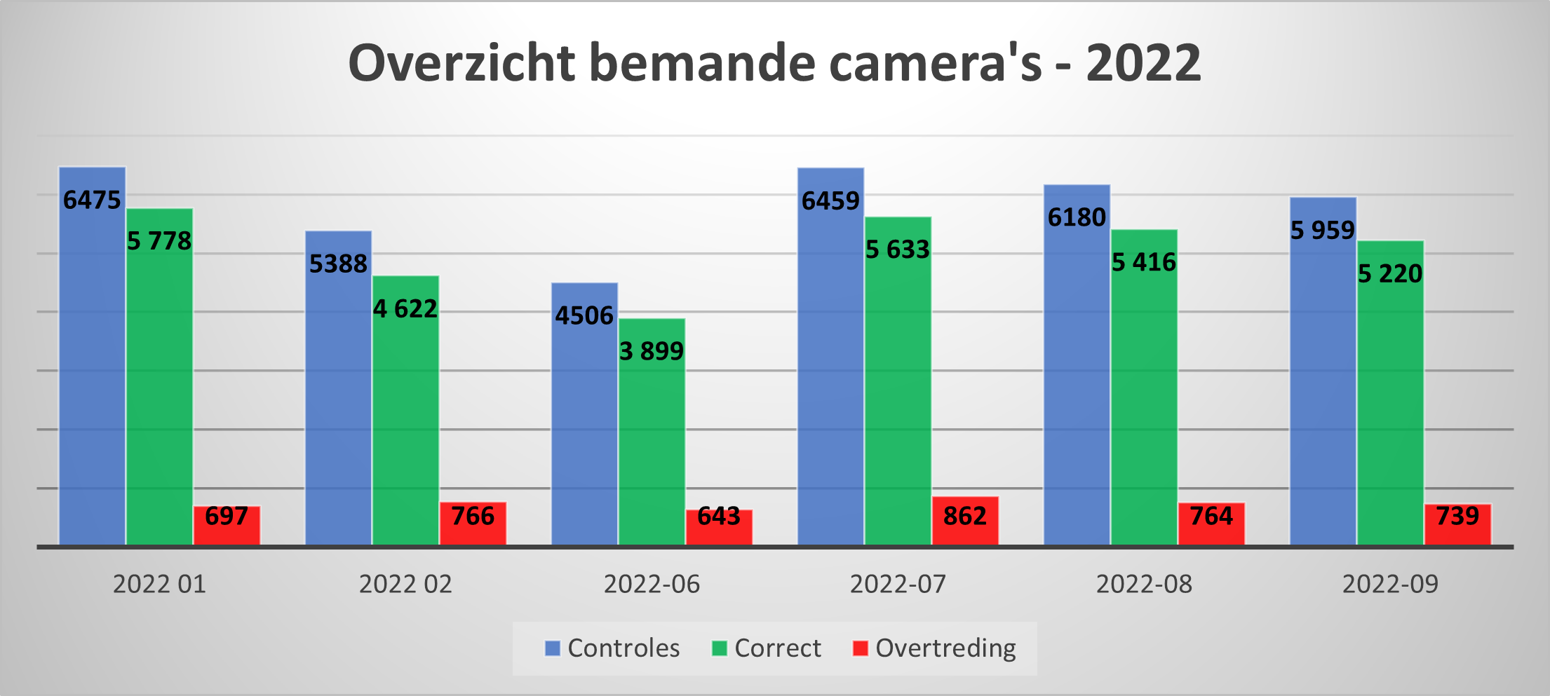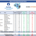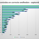 Voor september zijn in totaal (bemande en vaste camera’s) 14.483 voertuigen gecontroleerd. 13.424 chauffeurs reden de correcte snelheid, 1.059 reden te snel.