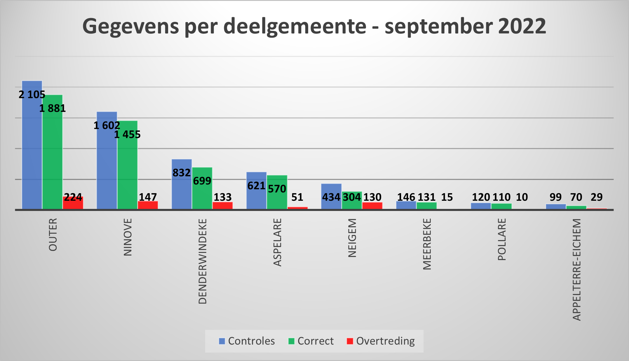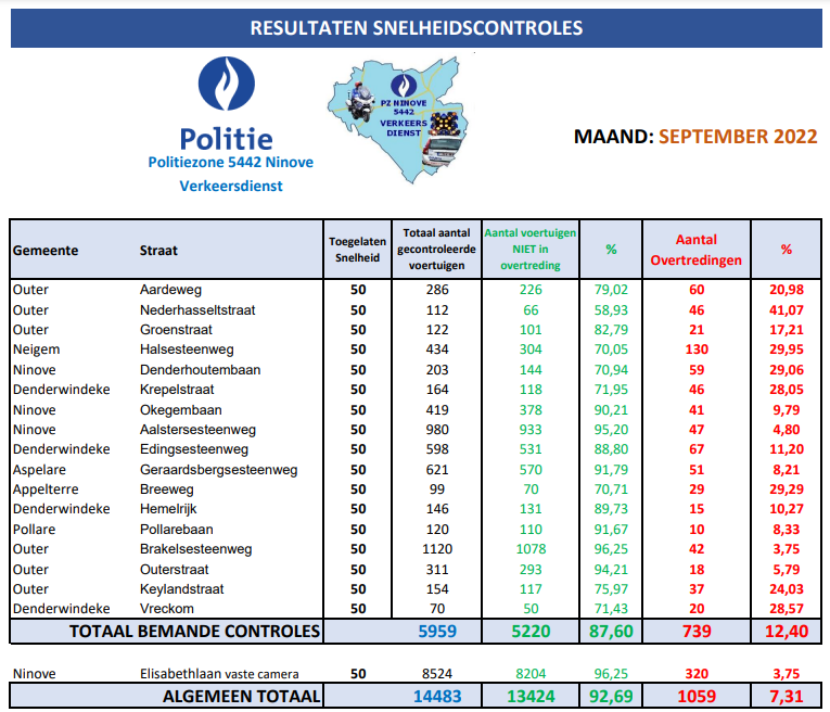 De lokale politie van Ninove publiceerde het overzicht van de snelheidscontroles in september. De bemande camera’s controleerden 5.959 voertuigen. 5.220 bestuurders (87,60 %) hielden zich aan de toegelaten snelheid.