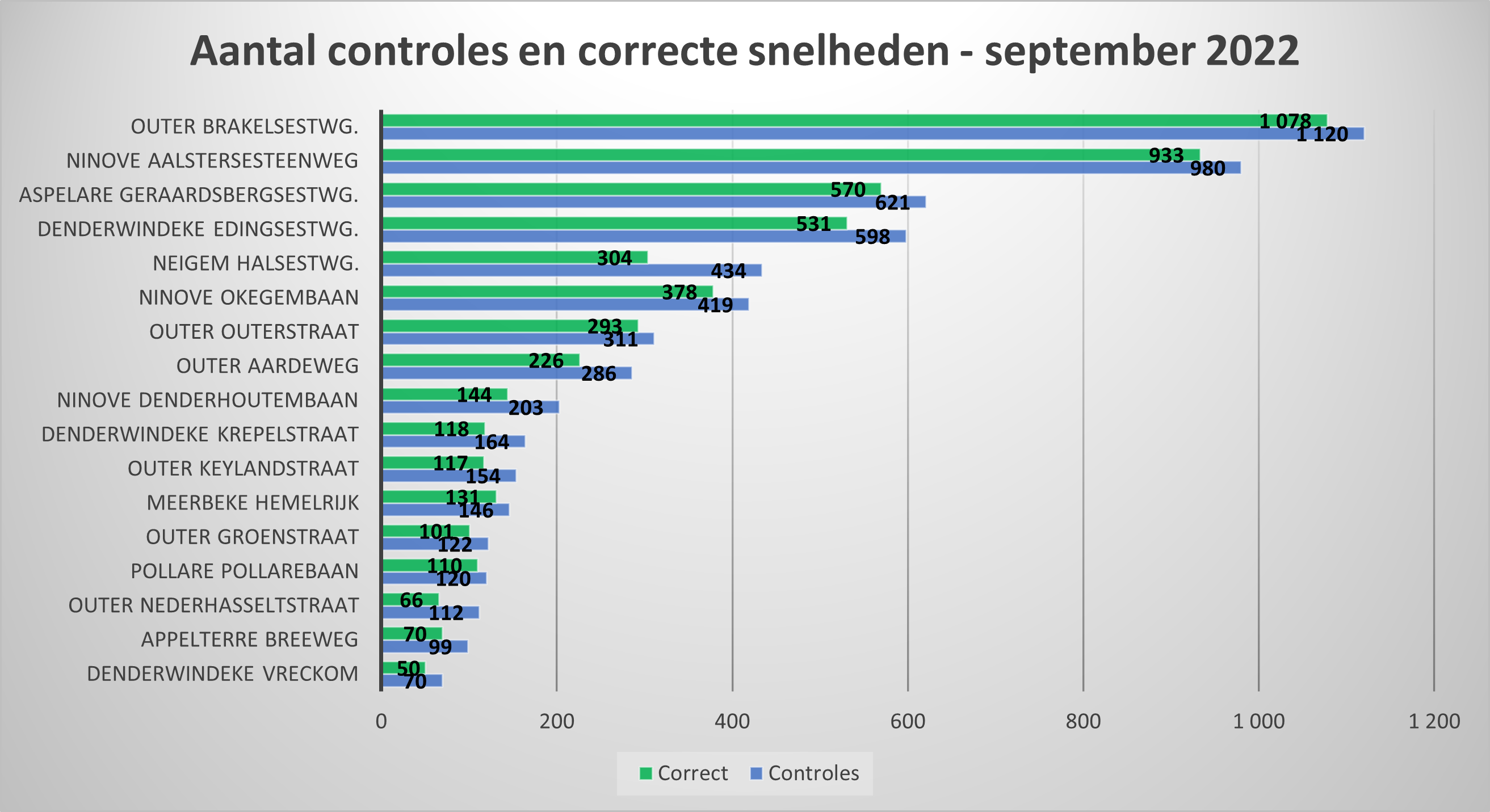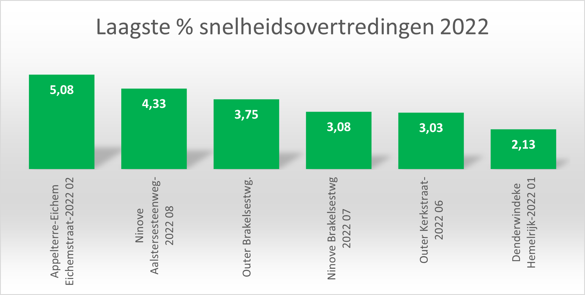 De laagste percentages snelheidsovertredingen zijn gemeten op de Brakelsesteenweg (3,75 %) en in de Outerstraat (5,79 %) in Outer en de Aalstersesteenweg in Ninove (4,80 %).