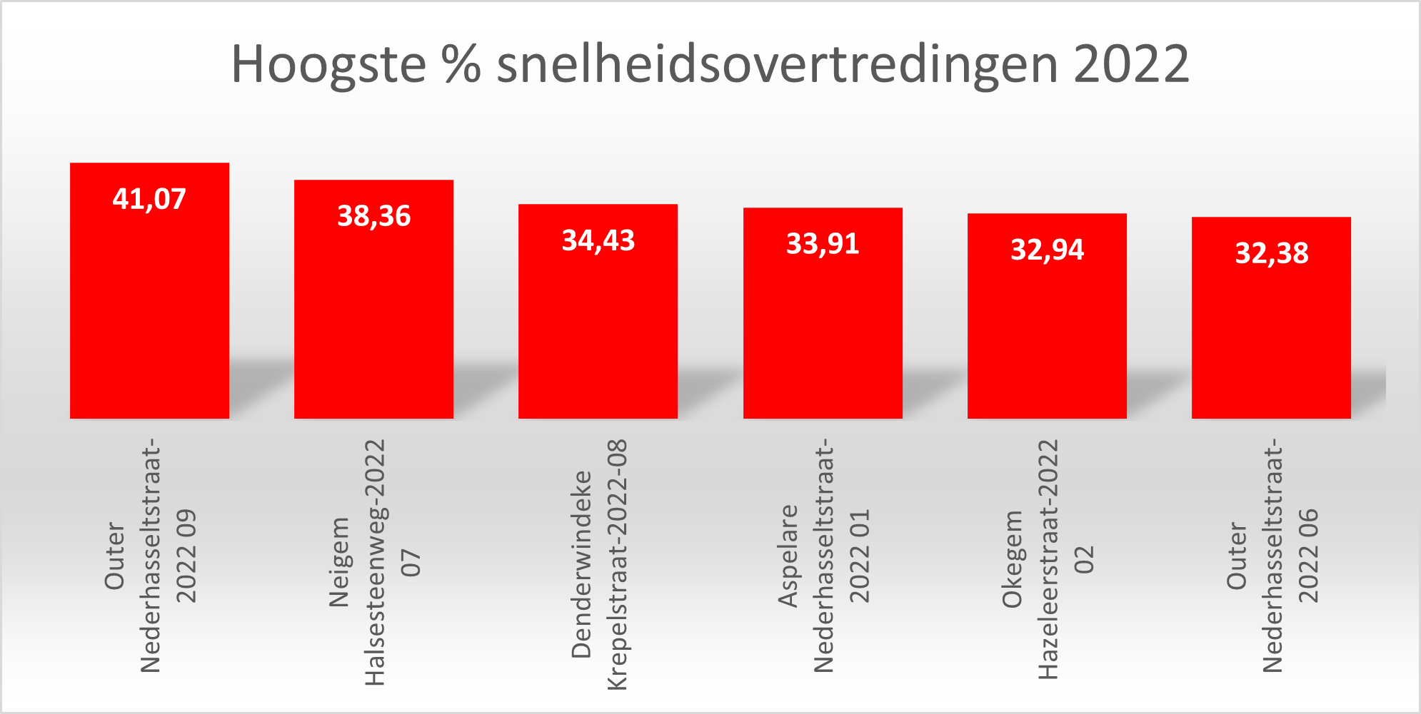 Naast de Nederhasseltstraat noteerde de verkeerseenheid ook hoge overtredingspercentages op de Halsesteenweg in Neigem (29,95 %), de Breeweg in Appelterre-Eichem (29,29 %), de Denderhoutembaan in Ninove (29,06 %), Vreckom (28,57 %) en de Krepelstraat (28,05 %) in Denderwindeke. Het zijn alle druk bereden doorgangs- of toegangswegen.